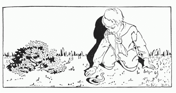 "When he gets littler, you mean," said John with a laugh. "No, no, he's too big for a swallow—a Michaelmas goose would be nothing to him for size. But here I am listening to your silly dreams instead of watering the melons and cucumbers!" And out he went to his garden, but in a minute he put his head in at the door and said, "You may go and tell him to get up[19] if you like. Poor little fellow! Only make him promise not to go chumming with spotted snakes any more, and not to bring them into the house, because somehow they disagree with me."