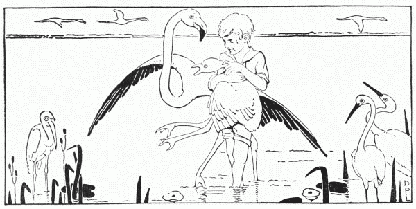 At length he made the discovery that the water of the stream was perpetually running away. If he dropped a leaf on the surface it would hasten down stream, and toss about and fret impatiently against anything that stood in its way, until, making its escape, it would quickly hurry out of sight. Whither did this rippling, running water go? He was anxious to find out. At length, losing all fear and fired with the sight of many new and pretty things he found while following it, he ran along the banks until, miles from home, he came to a great lake he could hardly see across, it was so broad. It was a wonderful place, full of birds; not small, fretful creatures flitting in and out of the rushes, but great majestic birds that took very little notice of him. Far out on the blue surface of the water floated numbers of wild fowl, and chief among them for grace and beauty was a swan, pure white with black head and neck and crimson bill. There also were stately flamingoes, stalking along knee-deep in the water, which was shallow; and nearer to the shore were flocks of rose-coloured spoonbills and solitary big grey herons standing motionless; also groups of white egrets,[23] and a great multitude of glossy ibises, with dark green and purple plumage and long sickle-like beaks.