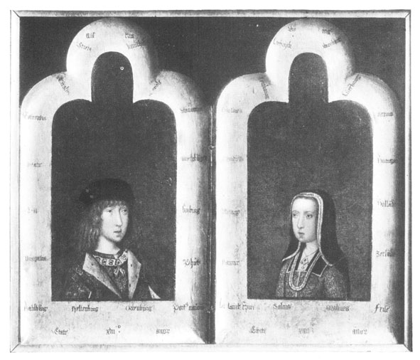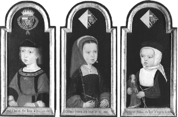 | From the Tapestry in the Musée du Cinquantenaire, Brussels. It contains portraits of Margaret and her Nephews and Nieces. (Photograph by Deloeul.) |