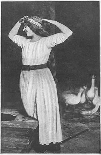 With the geese at her heels, she ran swiftly toward the pool and peered earnestly into its clear depths. Her hair hung in long golden strands on each side of her face, her eyes shone like stars, her cheeks were flushed.