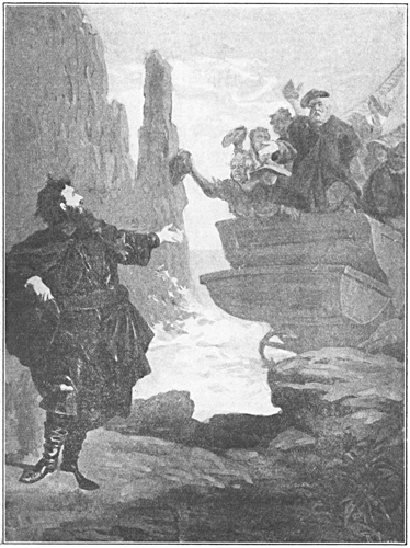 "Ah, ha!" cried he. "Here's the journey's end." Then, looking back into the woods and waving his cap, he shouted at the top of his voice: