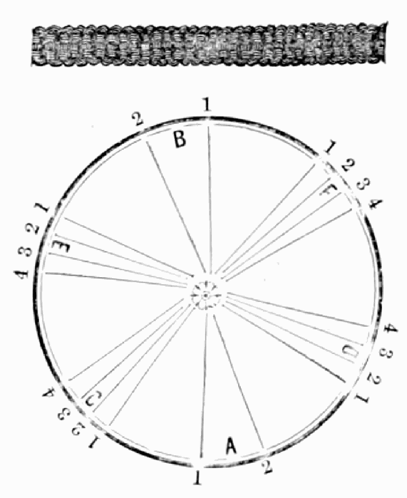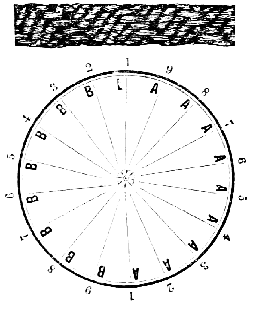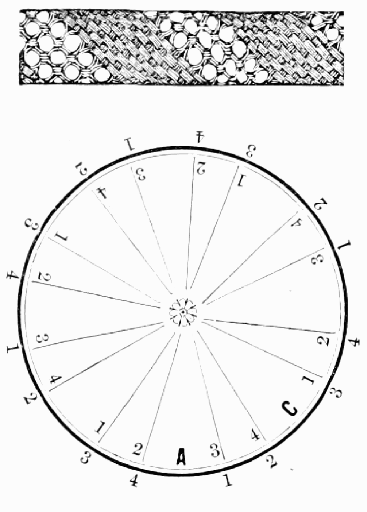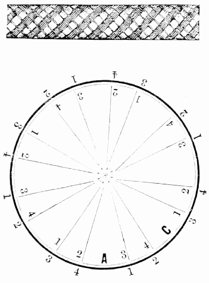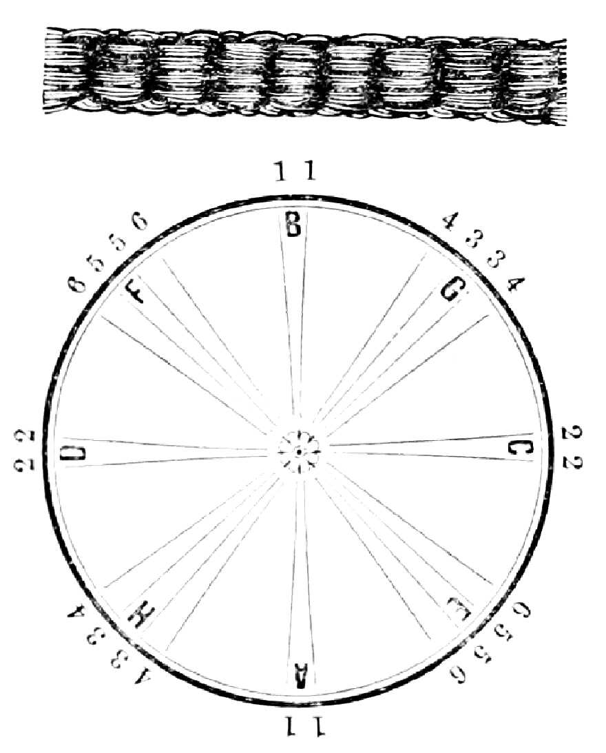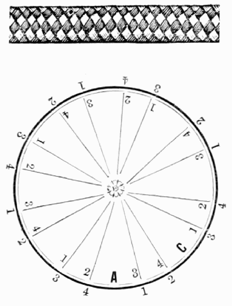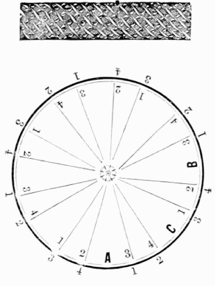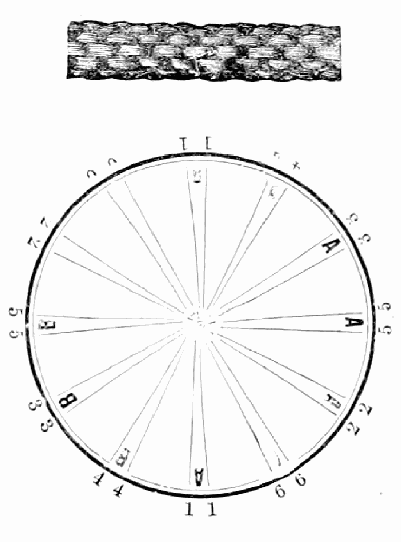Take sixteen strands, eighty hairs in a strand, and lay on table like pattern. Commence at A and B—take No. 1 at A in left hand and No. 1 at B in right hand, swing around table to the left, and change places with them; then take No. 7 at B in right hand and No. 7 at A in left hand, and swing around the table to the right and change places with them; then take No. 5 at A in right hand and No. 5 at B in left hand, and swing around the table to the left, and change places as before; then take No. 8 at A in right hand and No. 8 at B in left hand and swing around table to the left and change as before; then take No. 6 at A in left hand, and No. 6 at B in right hand and swing around table to the right and change as before; then take No. 4 at A in right hand and No. 4 at B in left hand, and swing around table to the left and change as before; then take No. 7 at A in right hand and No. 7 at B in left hand, swing around table to the left and change as before, then take No. 5 at A in left hand and No. 5 at B in right hand, swing around table to the right and change as before; then take No. 3 at A in right hand and No. 3 at B in left hand and swing around table to the left and change as before; then take No. 6 at A in right hand and No. 6 at B in left hand and swing around table to the left and change as before; then take No. 4 at A in left hand and No. 4 at[32] B in right hand and swing around table to the right and change as before; then take No. 2 at A in right hand and No. 2 at B in left hand and swing around table to the left and change as before; then take No. 5 at A in right hand and No. 5 at B in left hand and swing around table to the left and change as before, then take No. 3 at A in left hand and No. 3 at B in right hand, and swing around table to the right and change as before. Then commence at A as at first.