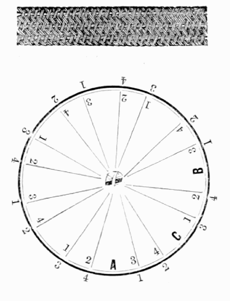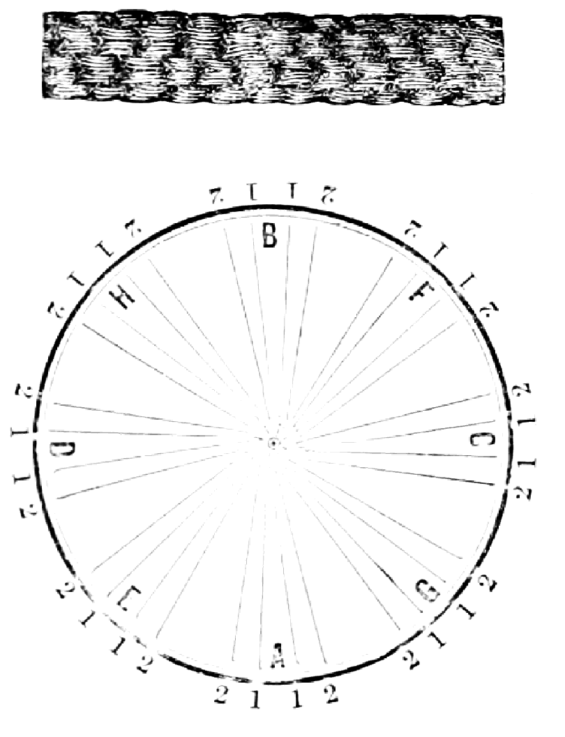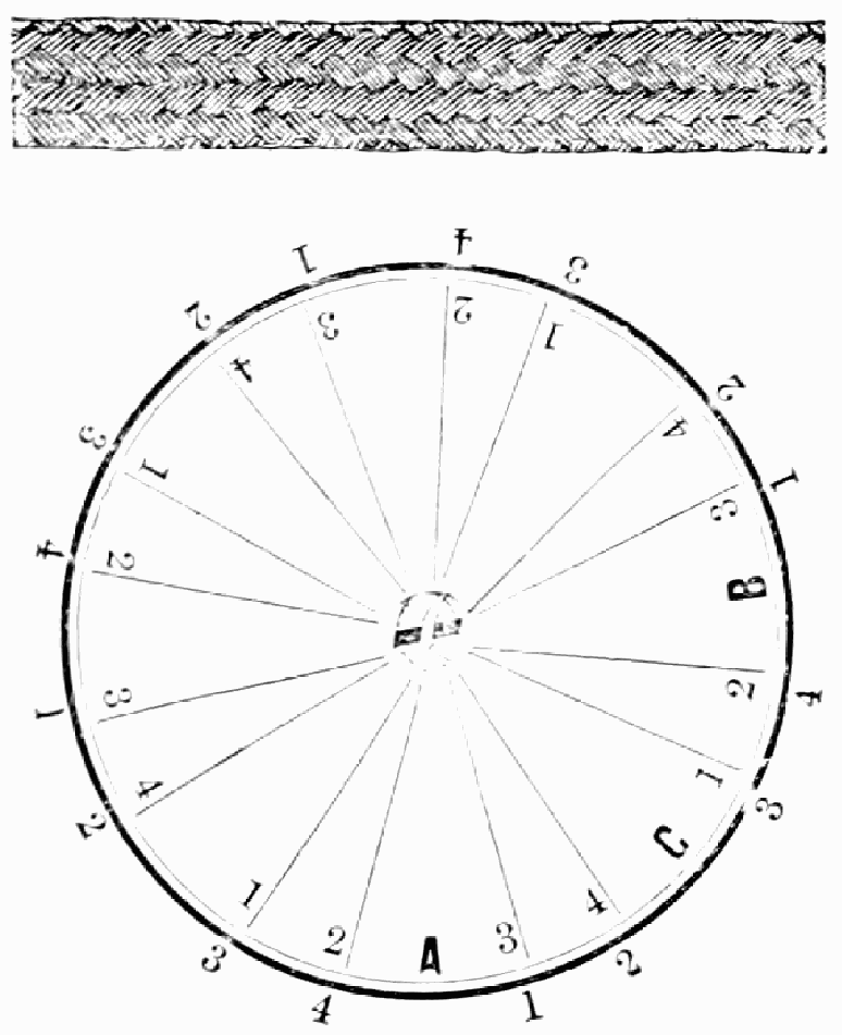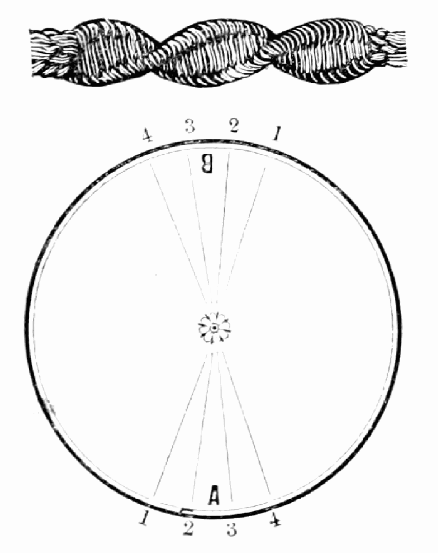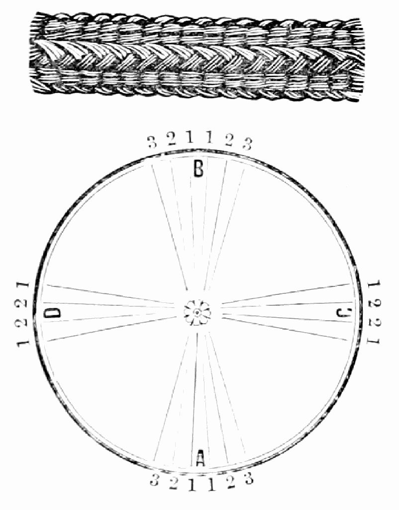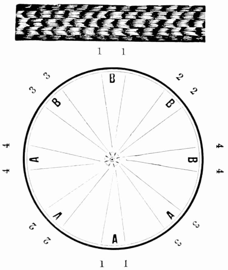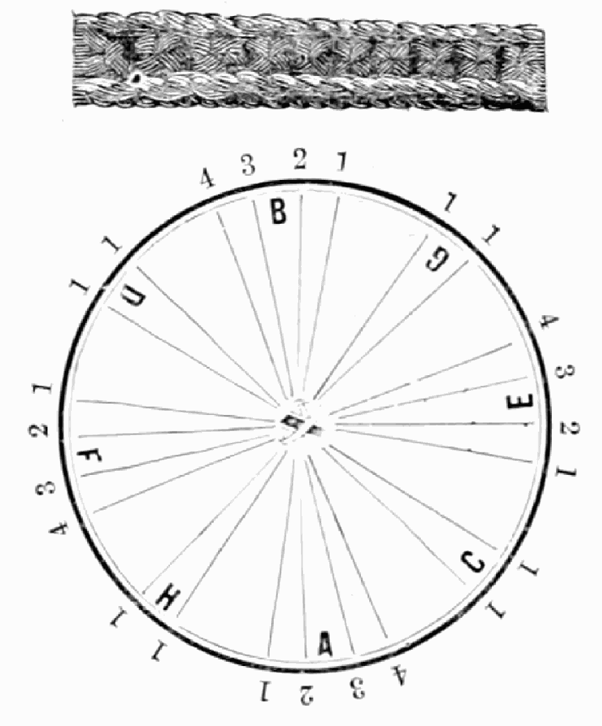 Take sixteen strands, eighty hairs in a strand, and lay on table like pattern. Commence at A and B—take No. 1 at A in left hand and No. 1 at B in right hand, swing around table to the left, and change places with them; then take No. 7 at B in right hand and No. 7 at A in left hand, and swing around the table to the right and change places with them; then take No. 5 at A in right hand and No. 5 at B in left hand, and swing around the table to the left, and change places as before; then take No. 8 at A in right hand and No. 8 at B in left hand and swing around table to the left and change as before; then take No. 6 at A in left hand, and No. 6 at B in right hand and swing around table to the right and change as before; then take No. 4 at A in right hand and No. 4 at B in left hand, and swing around table to the left and change as before; then take No. 7 at A in right hand and No. 7 at B in left hand, swing around table to the left and change as before, then take No. 5 at A in left hand and No. 5 at B in right hand, swing around table to the right and change as before; then take No. 3 at A in right hand and No. 3 at B in left hand and swing around table to the left and change as before; then take No. 6 at A in right hand and No. 6 at B in left hand and swing around table to the left and change as before; then take No. 4 at A in left hand and No. 4 at[32] B in right hand and swing around table to the right and change as before; then take No. 2 at A in right hand and No. 2 at B in left hand and swing around table to the left and change as before; then take No. 5 at A in right hand and No. 5 at B in left hand and swing around table to the left and change as before, then take No. 3 at A in left hand and No. 3 at B in right hand, and swing around table to the right and change as before. Then commence at A as at first.