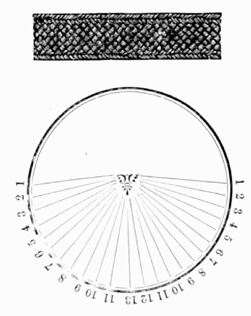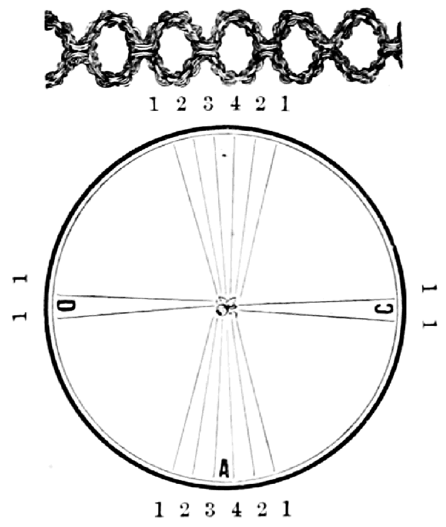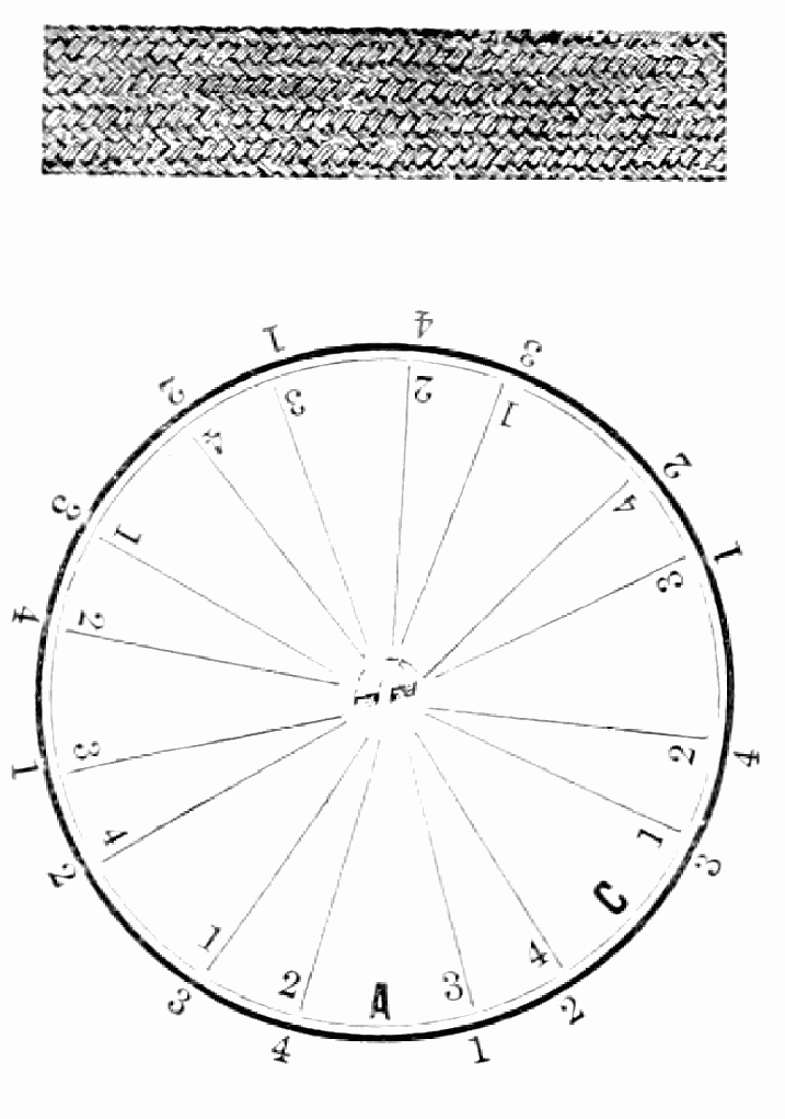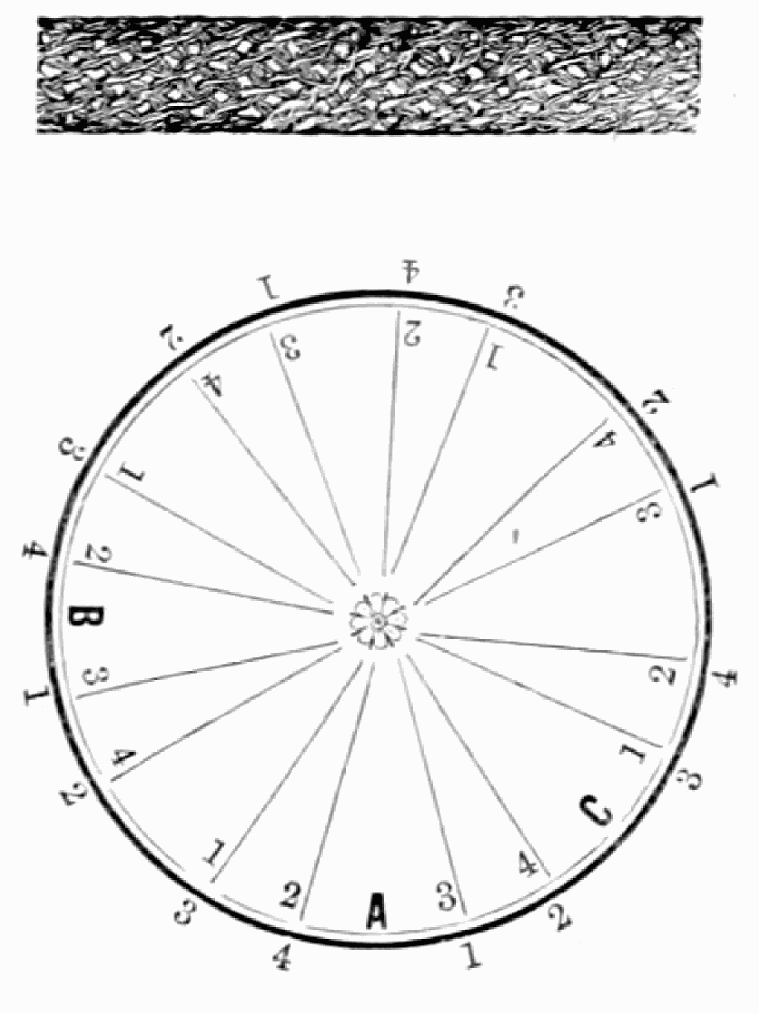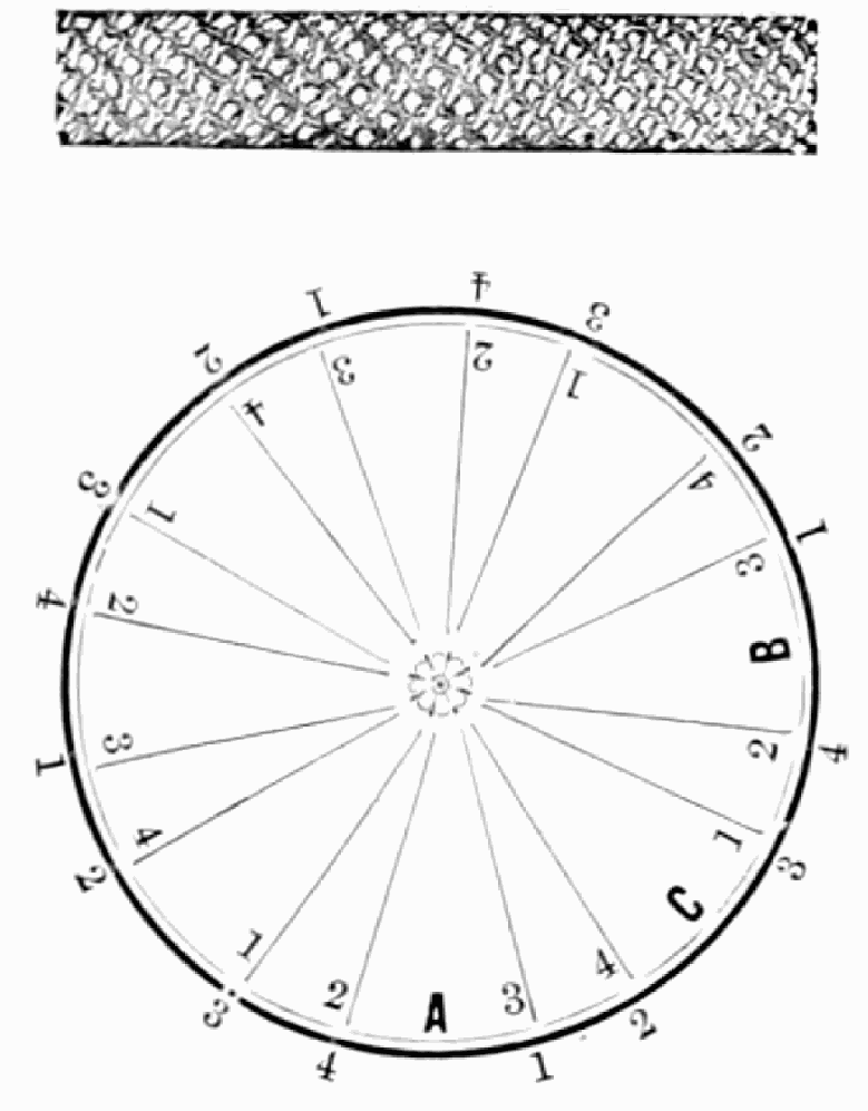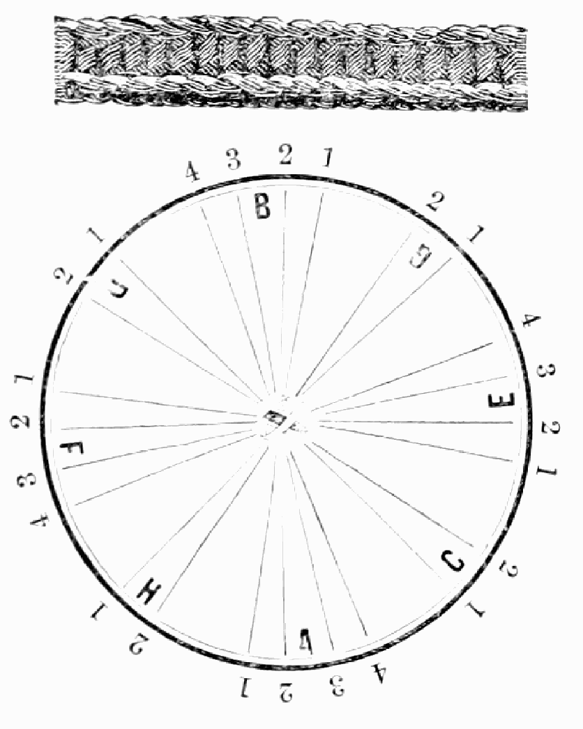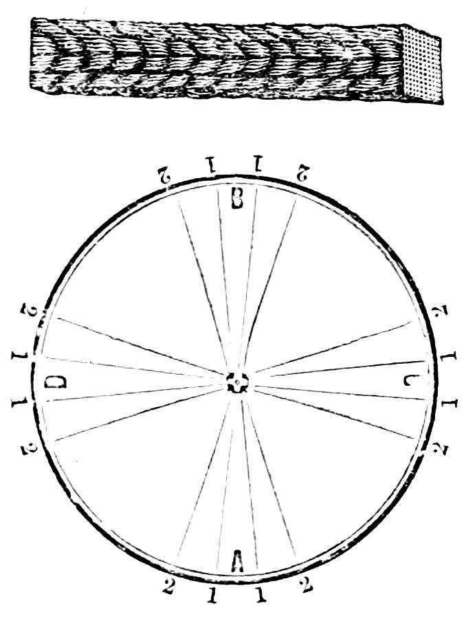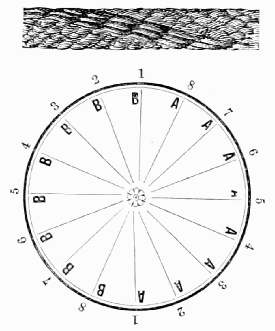 Take sixteen strands, eighty hairs in a strand, and lay on table like pattern. Commence at A and B—take No. 1 at A in left hand and No. 1 at B in right hand, swing around table to the left, and change places with them; then take No. 7 at B in right hand and No. 7 at A in left hand, and swing around the table to the right and change places with them; then take No. 5 at A in right hand and No. 5 at B in left hand, and swing around the table to the left, and change places as before; then take No. 8 at A in right hand and No. 8 at B in left hand and swing around table to the left and change as before; then take No. 6 at A in left hand, and No. 6 at B in right hand and swing around table to the right and change as before; then take No. 4 at A in right hand and No. 4 at B in left hand, and swing around table to the left and change as before; then take No. 7 at A in right hand and No. 7 at B in left hand, swing around table to the left and change as before, then take No. 5 at A in left hand and No. 5 at B in right hand, swing around table to the right and change as before; then take No. 3 at A in right hand and No. 3 at B in left hand and swing around table to the left and change as before; then take No. 6 at A in right hand and No. 6 at B in left hand and swing around table to the left and change as before; then take No. 4 at A in left hand and No. 4 at[32] B in right hand and swing around table to the right and change as before; then take No. 2 at A in right hand and No. 2 at B in left hand and swing around table to the left and change as before; then take No. 5 at A in right hand and No. 5 at B in left hand and swing around table to the left and change as before, then take No. 3 at A in left hand and No. 3 at B in right hand, and swing around table to the right and change as before. Then commence at A as at first.