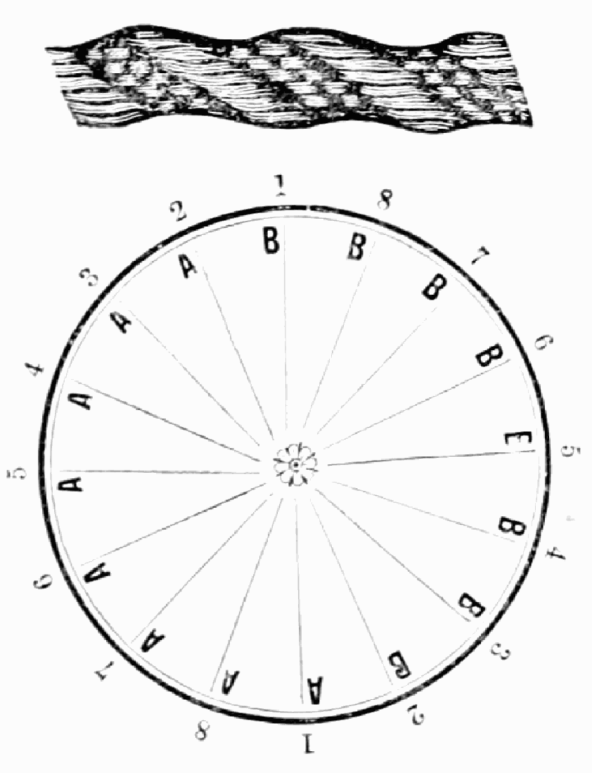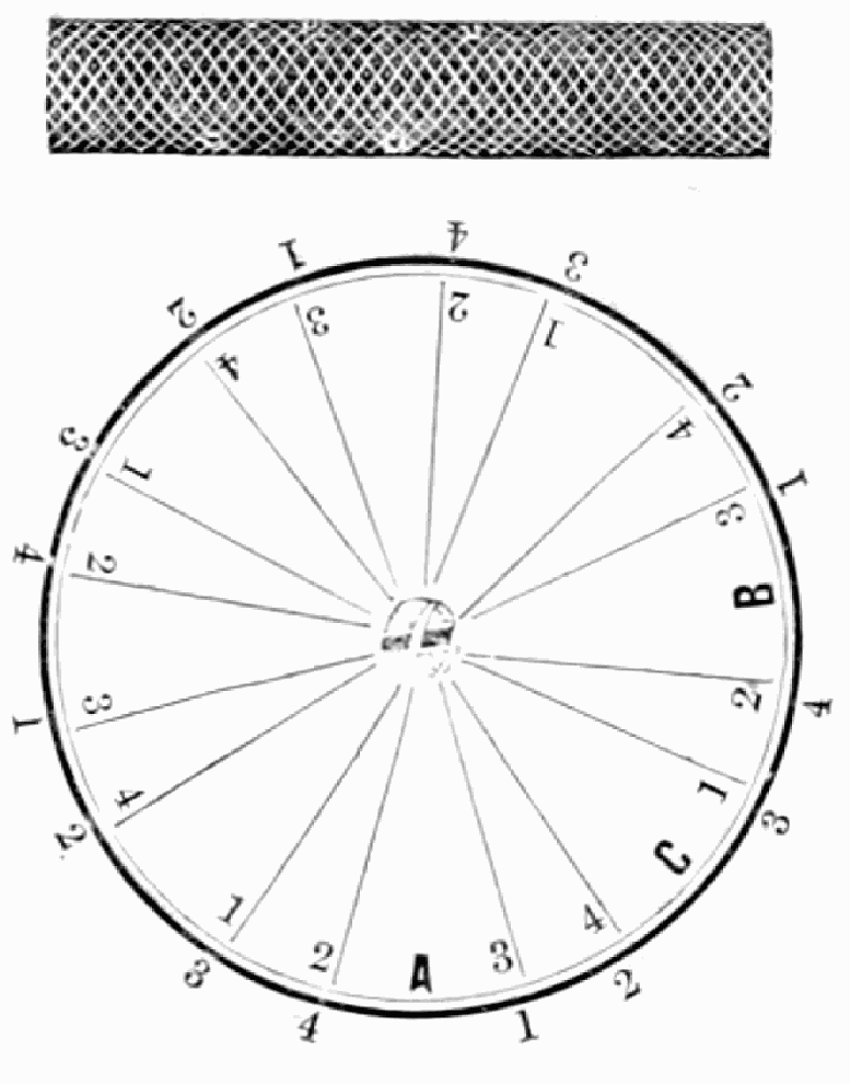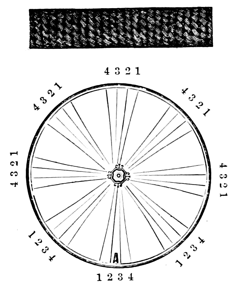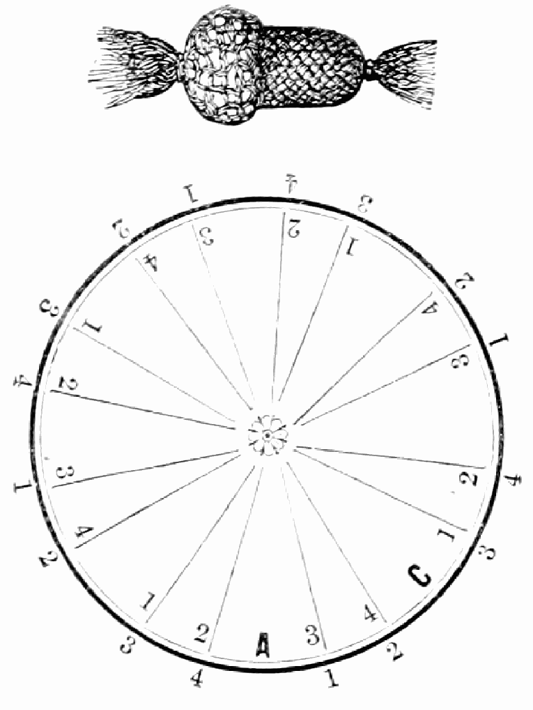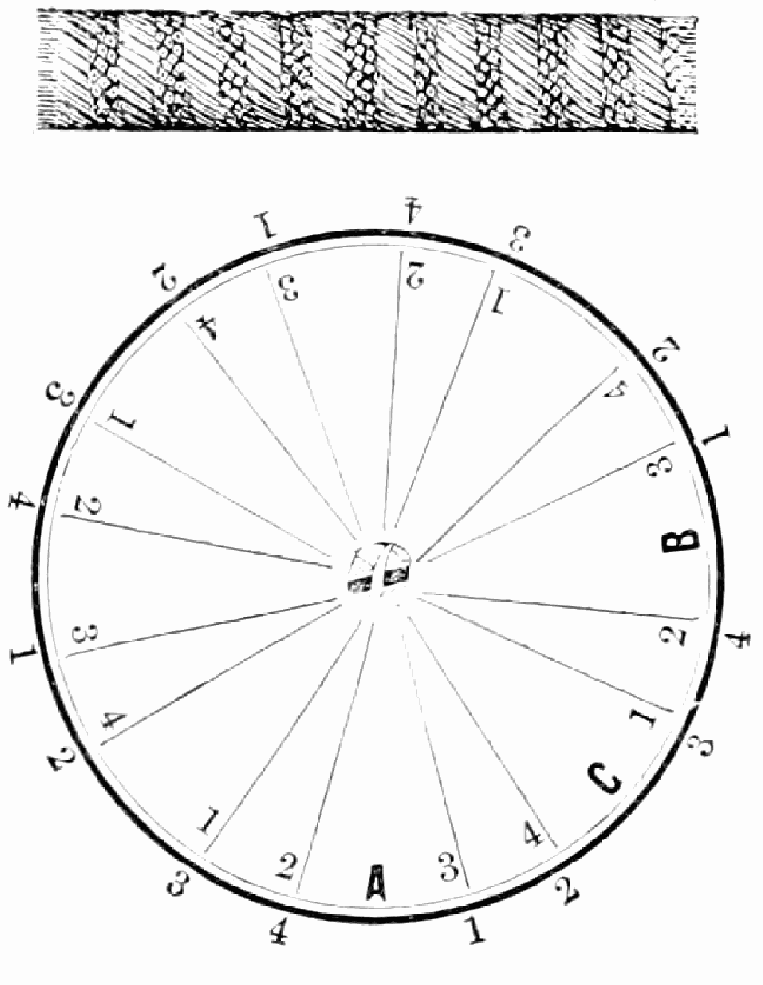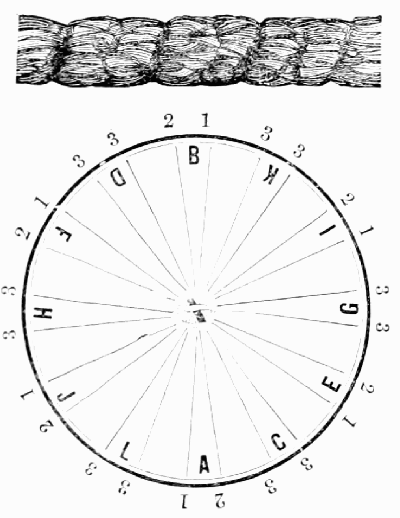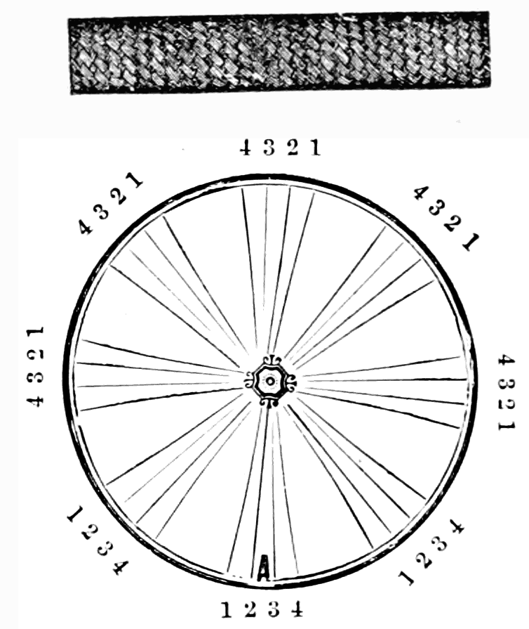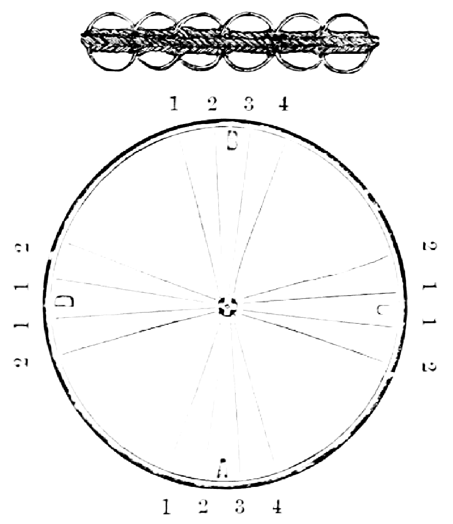 Take sixteen strands, eighty hairs in a strand, and lay on table like pattern. Commence at A and B—take No. 1 at A in left hand and No. 1 at B in right hand, swing around table to the left, and change places with them; then take No. 7 at B in right hand and No. 7 at A in left hand, and swing around the table to the right and change places with them; then take No. 5 at A in right hand and No. 5 at B in left hand, and swing around the table to the left, and change places as before; then take No. 8 at A in right hand and No. 8 at B in left hand and swing around table to the left and change as before; then take No. 6 at A in left hand, and No. 6 at B in right hand and swing around table to the right and change as before; then take No. 4 at A in right hand and No. 4 at B in left hand, and swing around table to the left and change as before; then take No. 7 at A in right hand and No. 7 at B in left hand, swing around table to the left and change as before, then take No. 5 at A in left hand and No. 5 at B in right hand, swing around table to the right and change as before; then take No. 3 at A in right hand and No. 3 at B in left hand and swing around table to the left and change as before; then take No. 6 at A in right hand and No. 6 at B in left hand and swing around table to the left and change as before; then take No. 4 at A in left hand and No. 4 at[32] B in right hand and swing around table to the right and change as before; then take No. 2 at A in right hand and No. 2 at B in left hand and swing around table to the left and change as before; then take No. 5 at A in right hand and No. 5 at B in left hand and swing around table to the left and change as before, then take No. 3 at A in left hand and No. 3 at B in right hand, and swing around table to the right and change as before. Then commence at A as at first.
