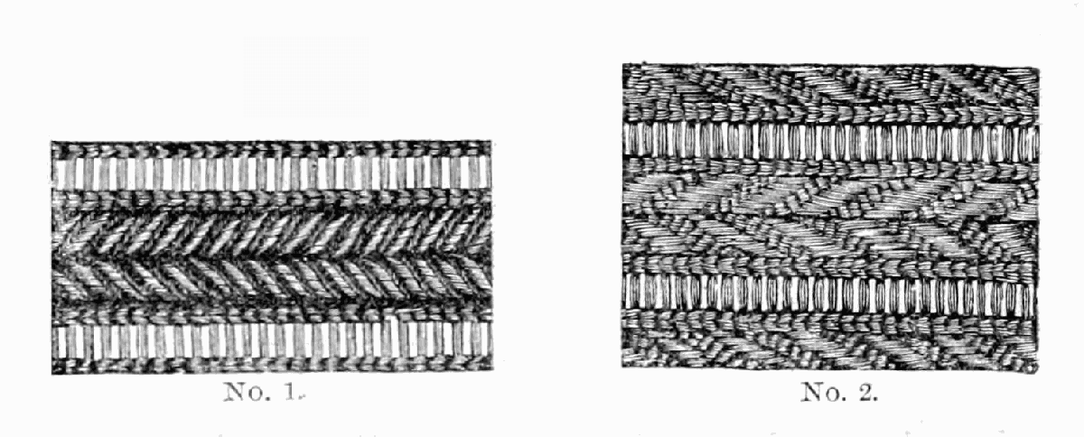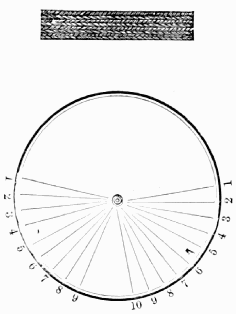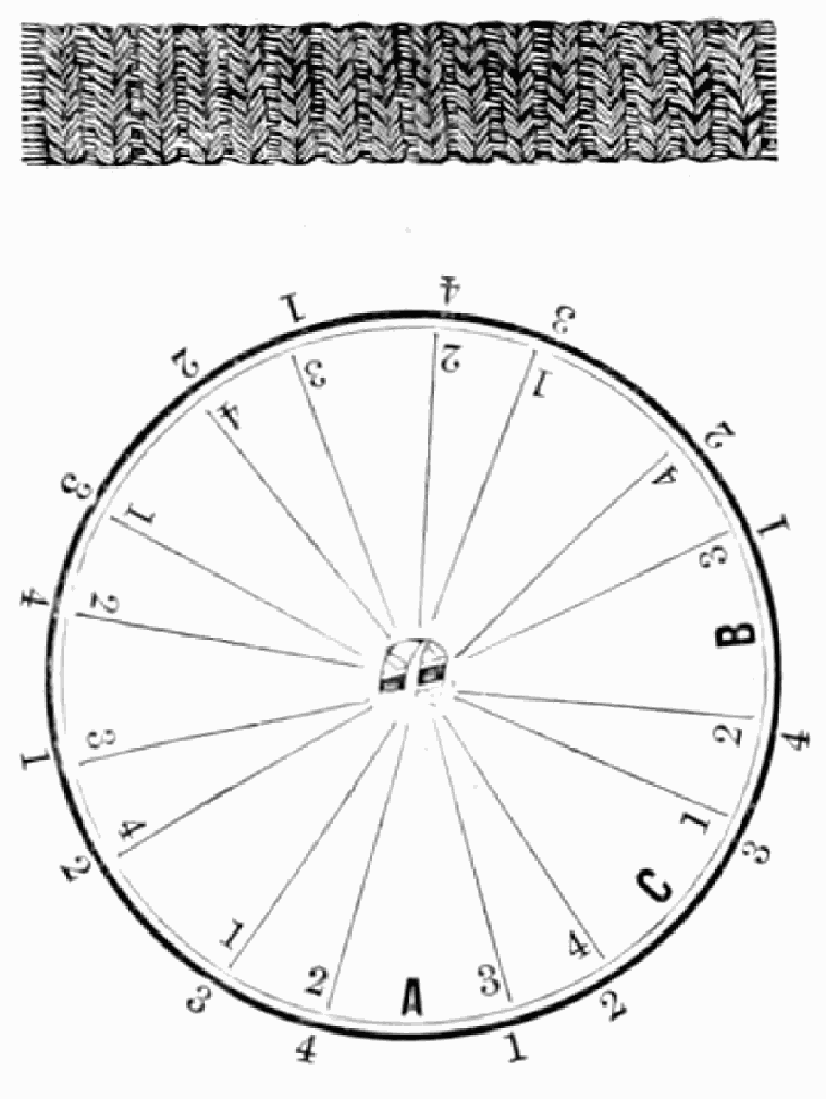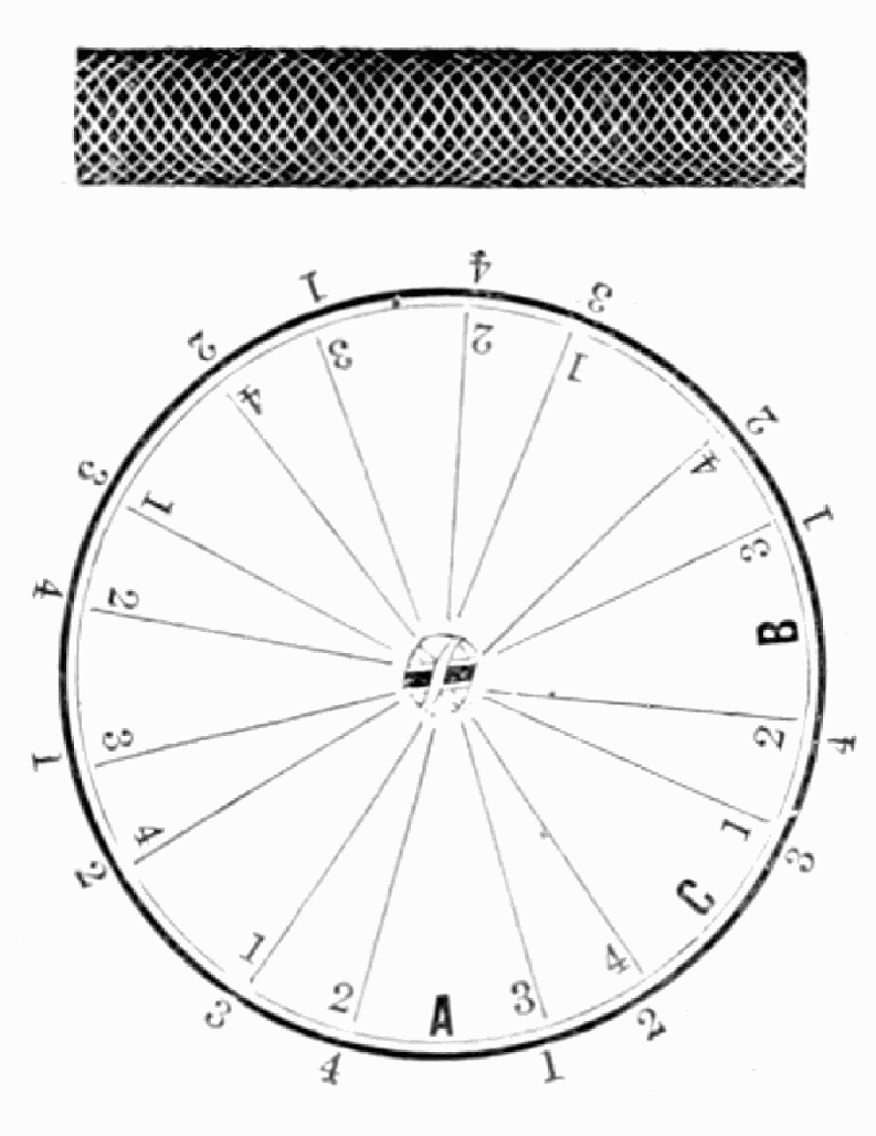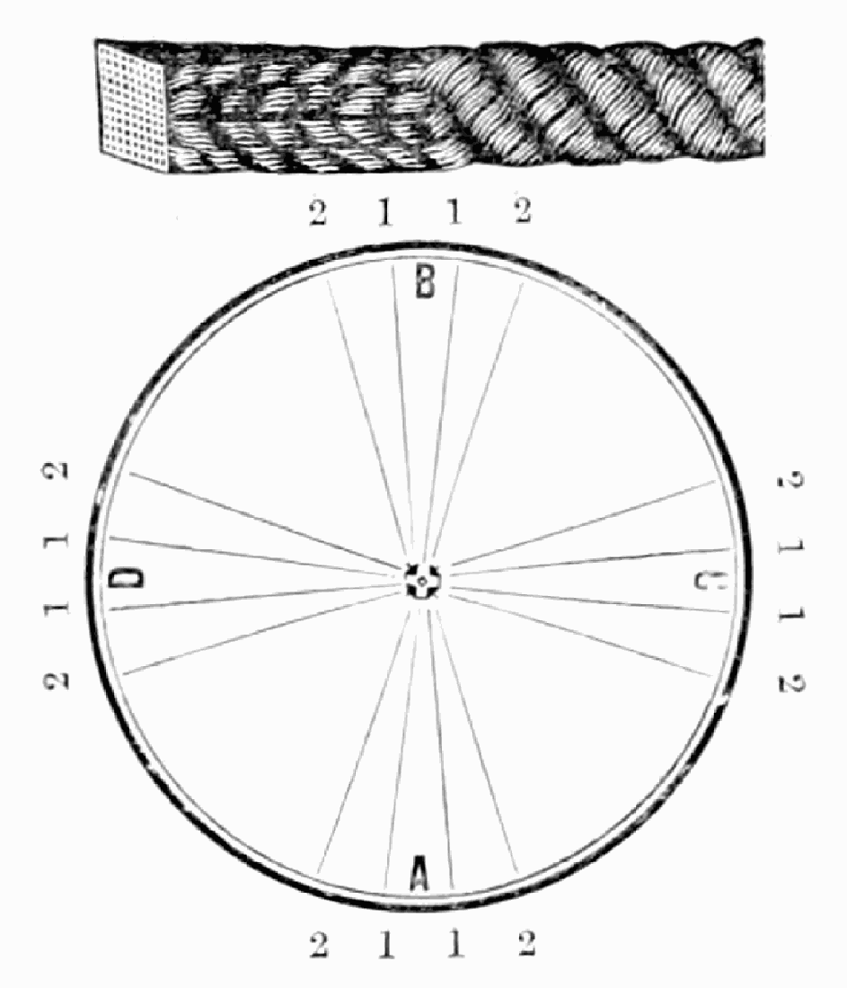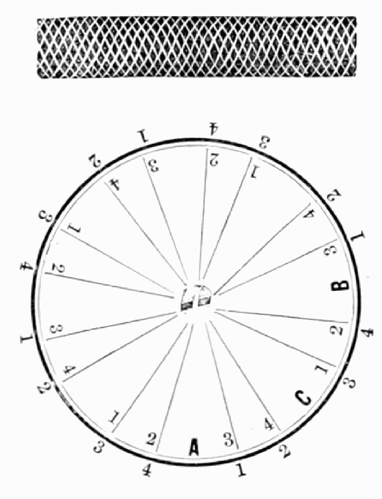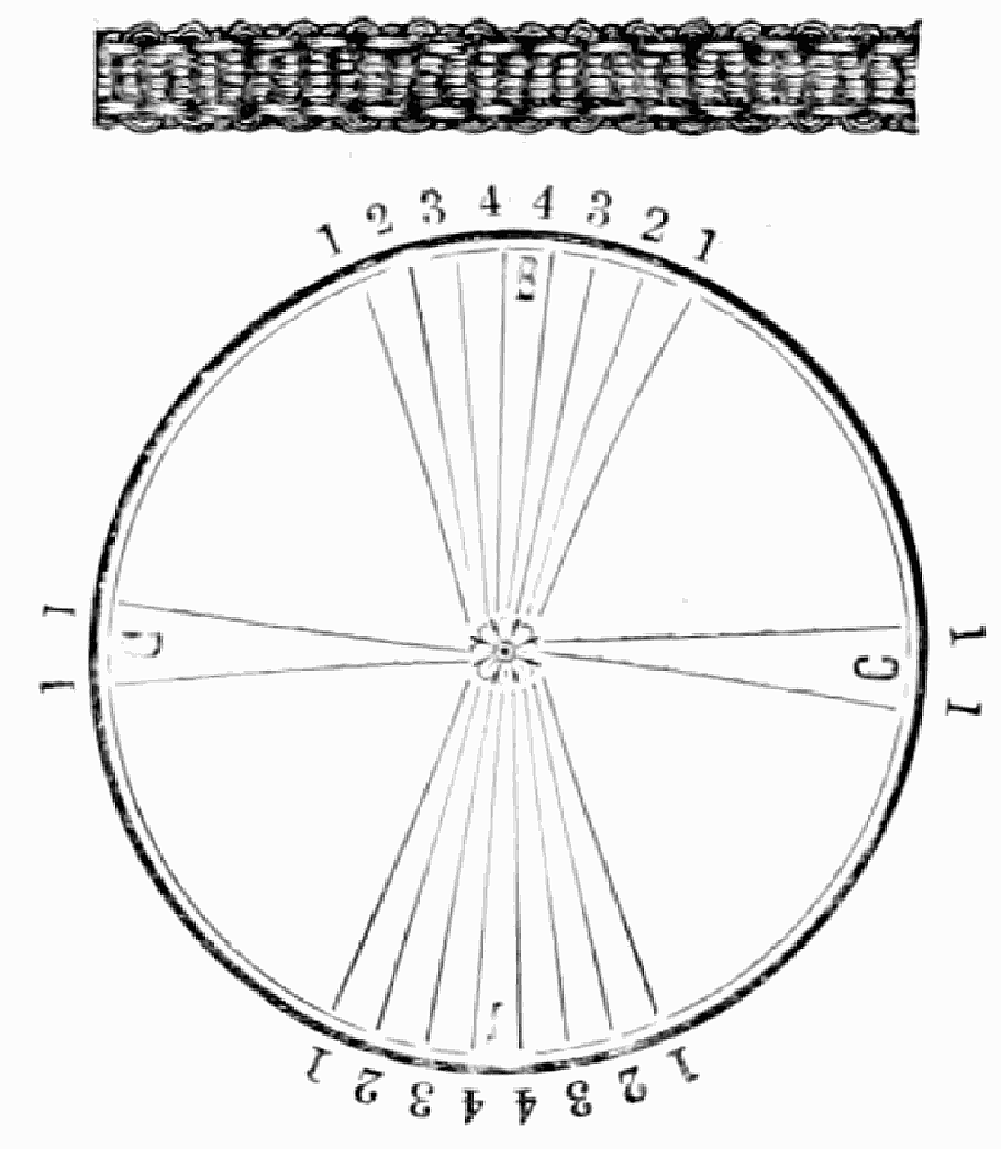 Take sixteen strands, eighty hairs in a strand, and lay on table like pattern. Commence at A and B—take No. 1 at A in left hand and No. 1 at B in right hand, swing around table to the left, and change places with them; then take No. 7 at B in right hand and No. 7 at A in left hand, and swing around the table to the right and change places with them; then take No. 5 at A in right hand and No. 5 at B in left hand, and swing around the table to the left, and change places as before; then take No. 8 at A in right hand and No. 8 at B in left hand and swing around table to the left and change as before; then take No. 6 at A in left hand, and No. 6 at B in right hand and swing around table to the right and change as before; then take No. 4 at A in right hand and No. 4 at B in left hand, and swing around table to the left and change as before; then take No. 7 at A in right hand and No. 7 at B in left hand, swing around table to the left and change as before, then take No. 5 at A in left hand and No. 5 at B in right hand, swing around table to the right and change as before; then take No. 3 at A in right hand and No. 3 at B in left hand and swing around table to the left and change as before; then take No. 6 at A in right hand and No. 6 at B in left hand and swing around table to the left and change as before; then take No. 4 at A in left hand and No. 4 at[32] B in right hand and swing around table to the right and change as before; then take No. 2 at A in right hand and No. 2 at B in left hand and swing around table to the left and change as before; then take No. 5 at A in right hand and No. 5 at B in left hand and swing around table to the left and change as before, then take No. 3 at A in left hand and No. 3 at B in right hand, and swing around table to the right and change as before. Then commence at A as at first.