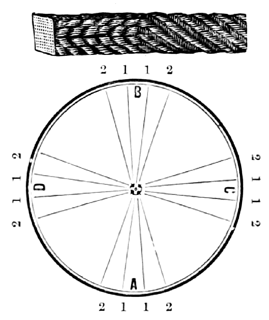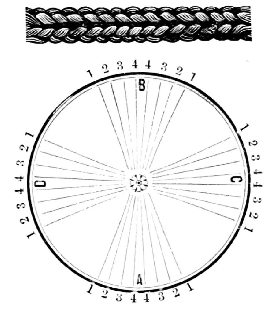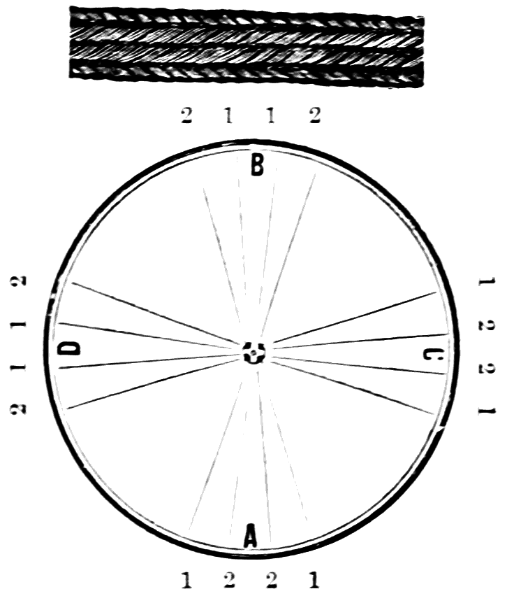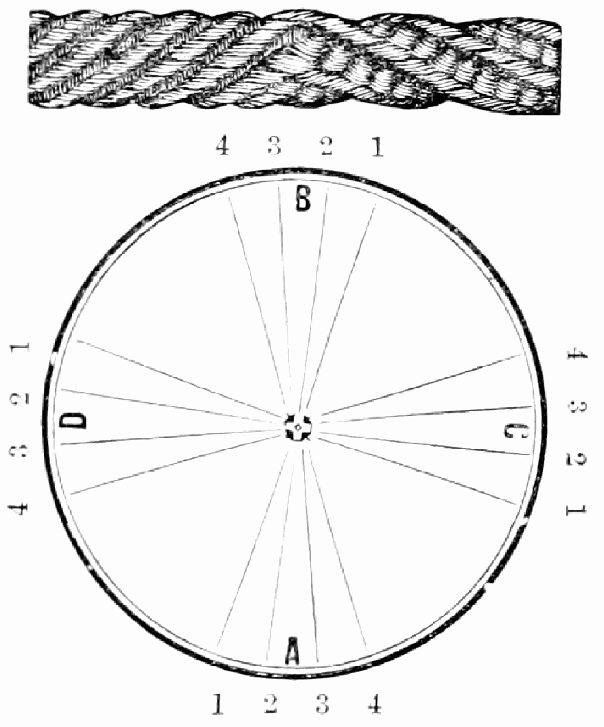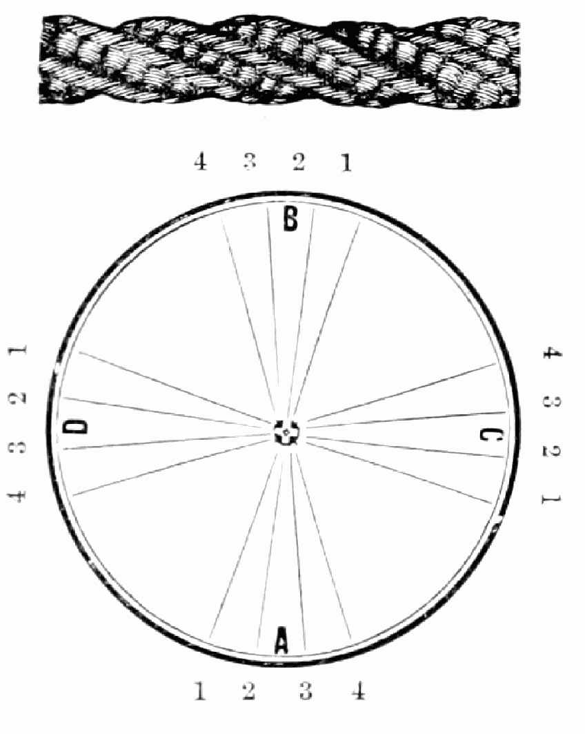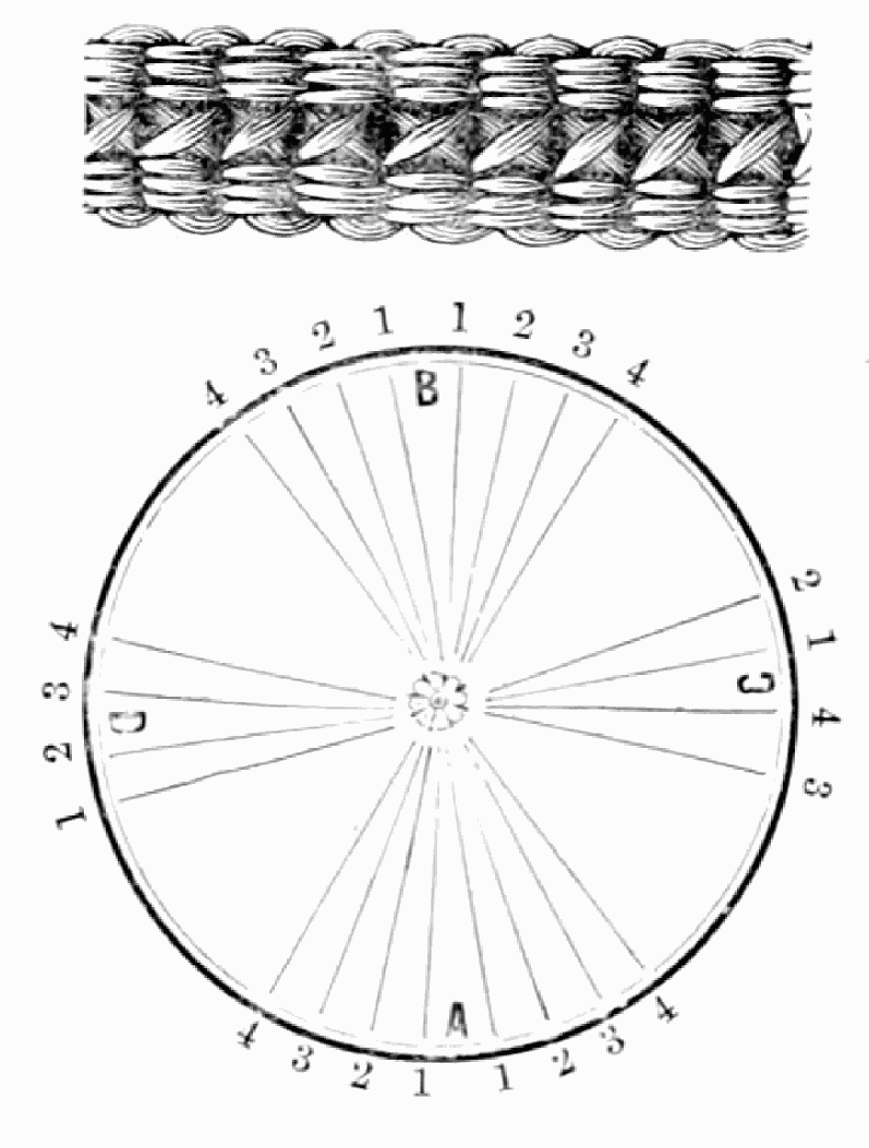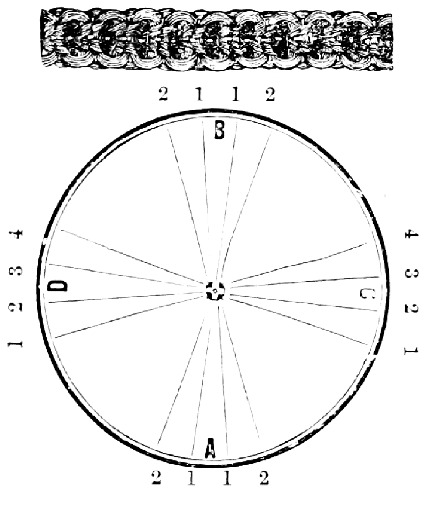 Take sixteen strands, seventy-five hairs in a strand, and place on the table like pattern. Commence at A take Nos. 1 and 2, lift across the table to B, and lay No. 1 outside of No. 4, and lay No. 2 between Nos. 1 and 2, and bring back Nos. 1 and 2 from B to A, and lay No. 1 outside of No. 4, and No. 2 outside of No. 1 at A; then go to C and take Nos. 1 and 2, lift over table to D and lay No. 1 outside of No. 4, and lay No. 2 between Nos. 1 and 2, and bring back Nos. 1 and 2 from C, and lay No. 1 outside of No. 4, and No. 2 outside of No. 1 at C; then go to B and change the same, and so on around the table to the right until the braid is finished.