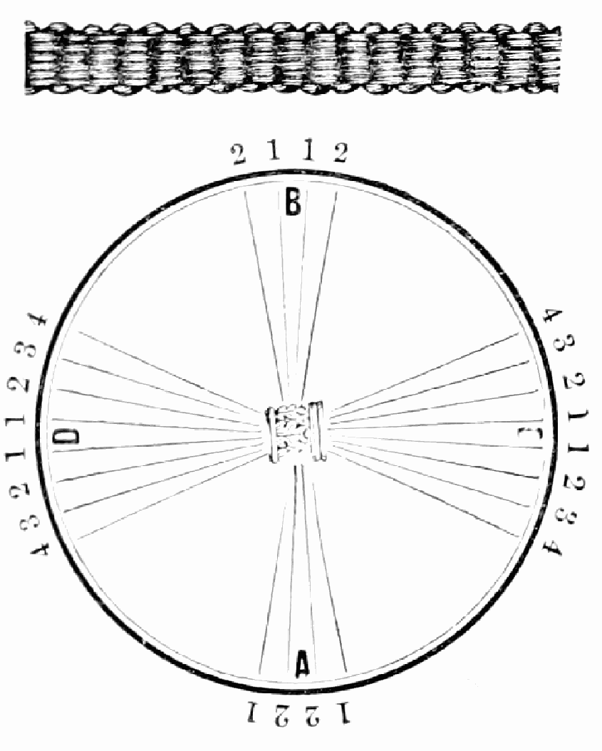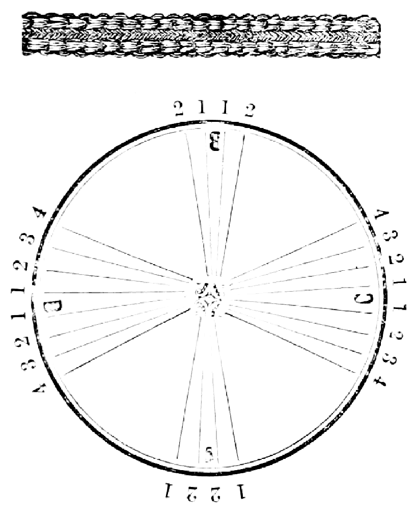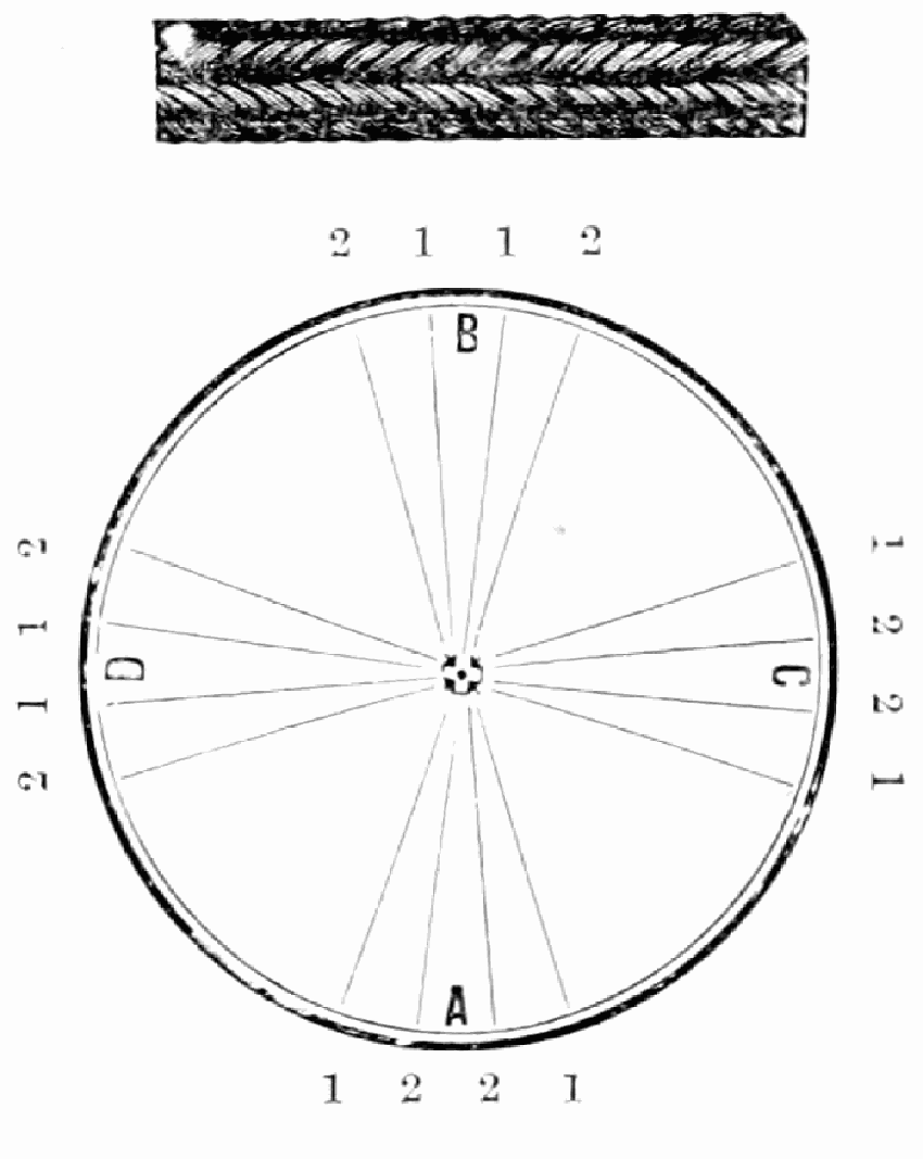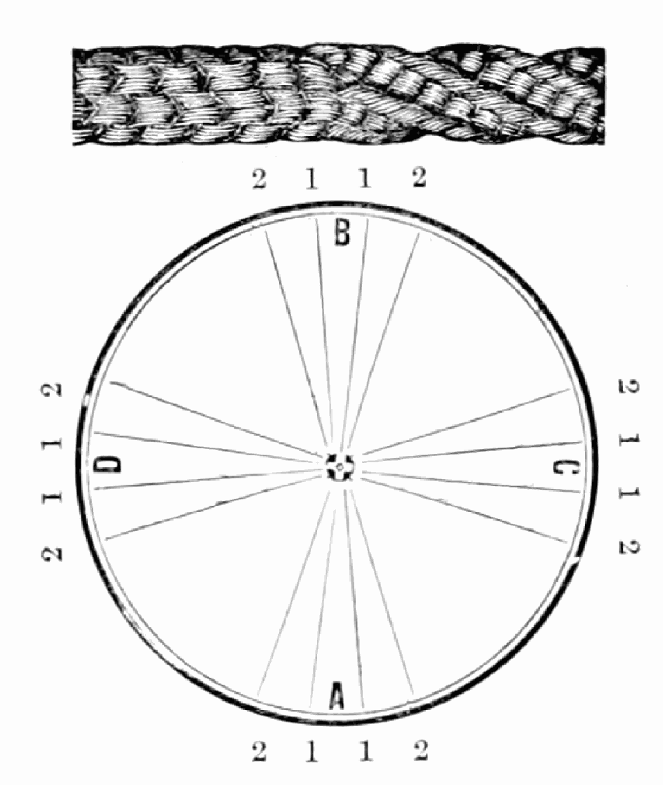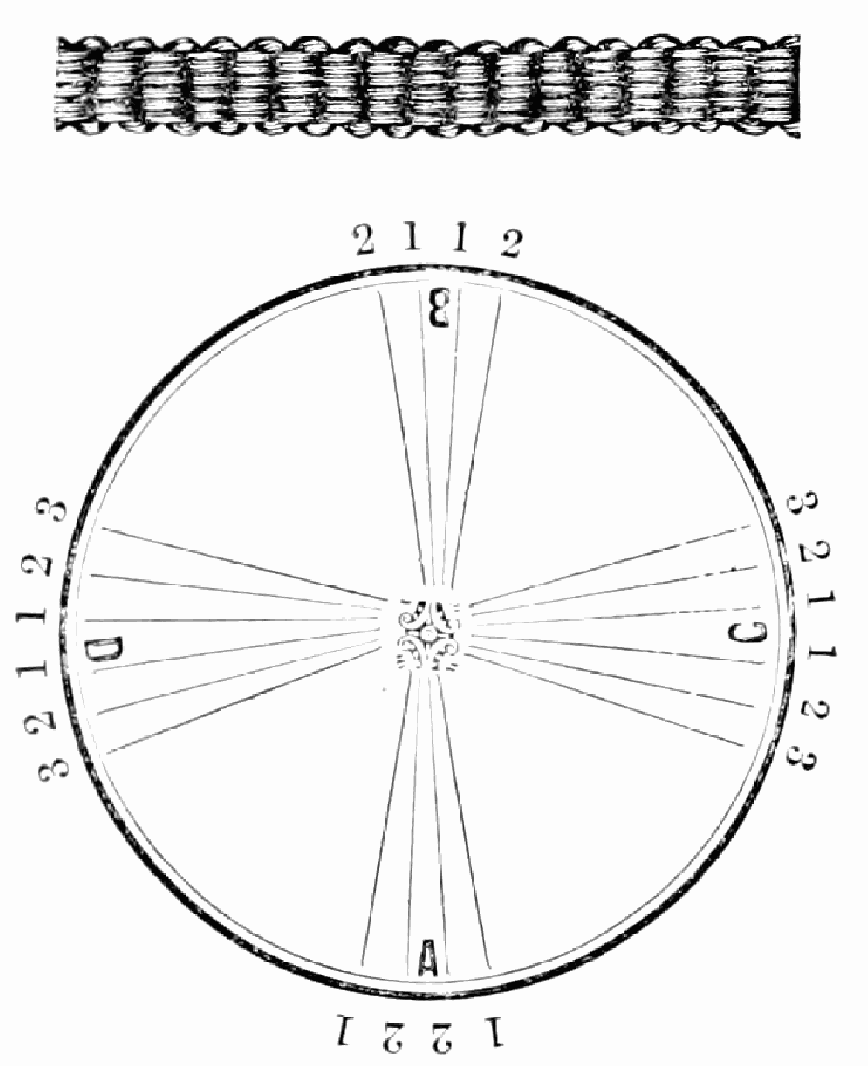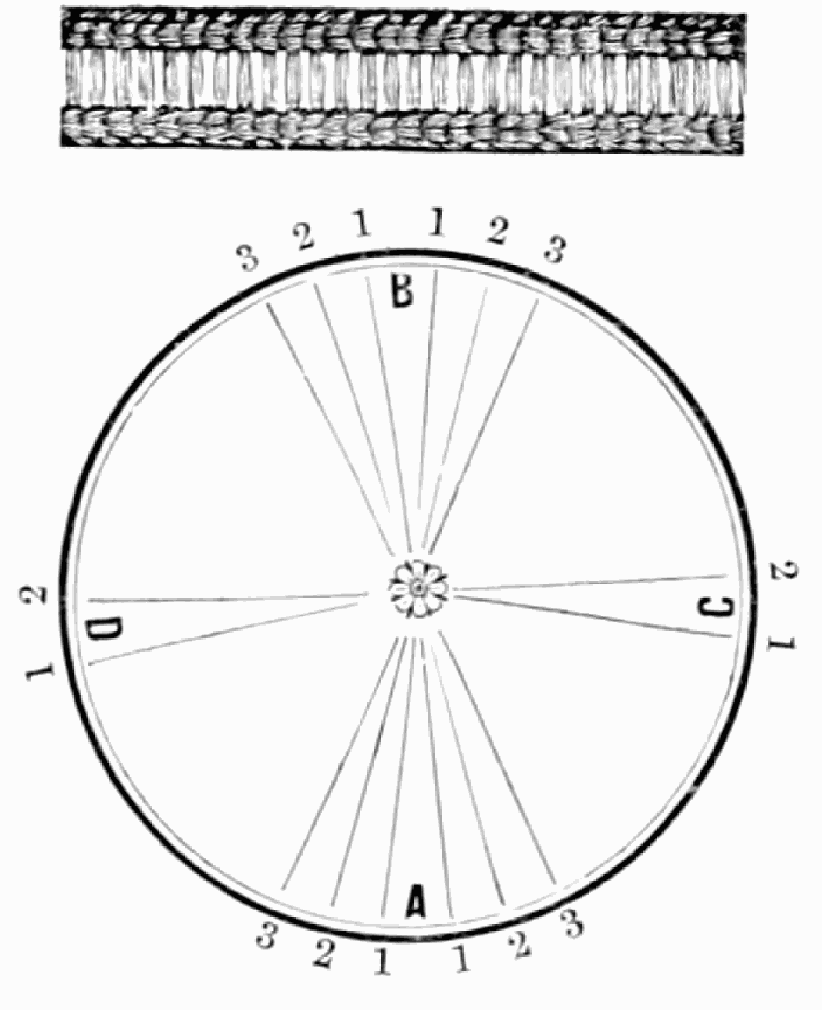 Take sixteen strands, seventy-five hairs in a strand, and place on the table like pattern. Commence at A take Nos. 1 and 2, lift across the table to B, and lay No. 1 outside of No. 4, and lay No. 2 between Nos. 1 and 2, and bring back Nos. 1 and 2 from B to A, and lay No. 1 outside of No. 4, and No. 2 outside of No. 1 at A; then go to C and take Nos. 1 and 2, lift over table to D and lay No. 1 outside of No. 4, and lay No. 2 between Nos. 1 and 2, and bring back Nos. 1 and 2 from C, and lay No. 1 outside of No. 4, and No. 2 outside of No. 1 at C; then go to B and change the same, and so on around the table to the right until the braid is finished.