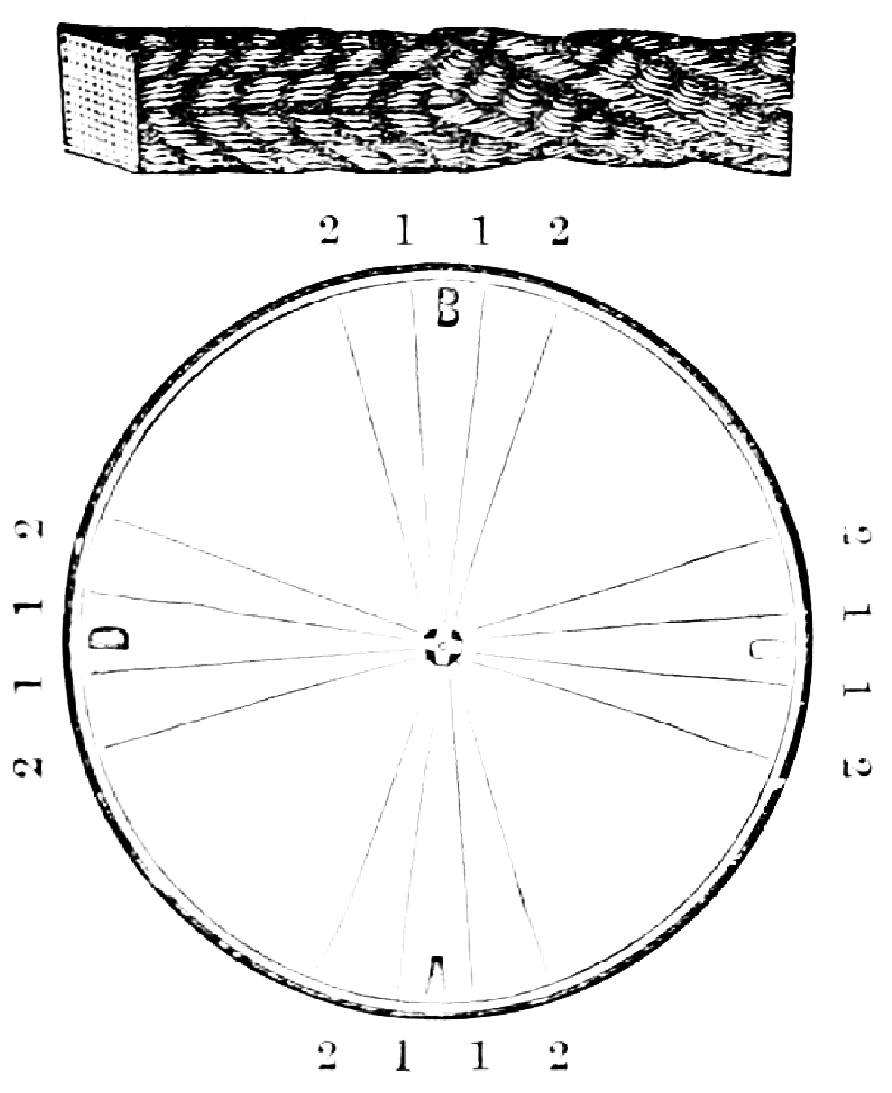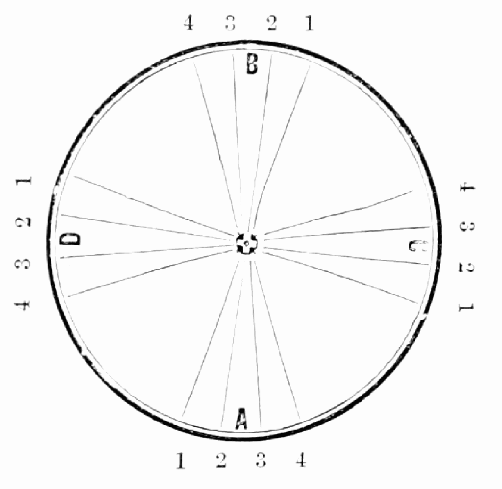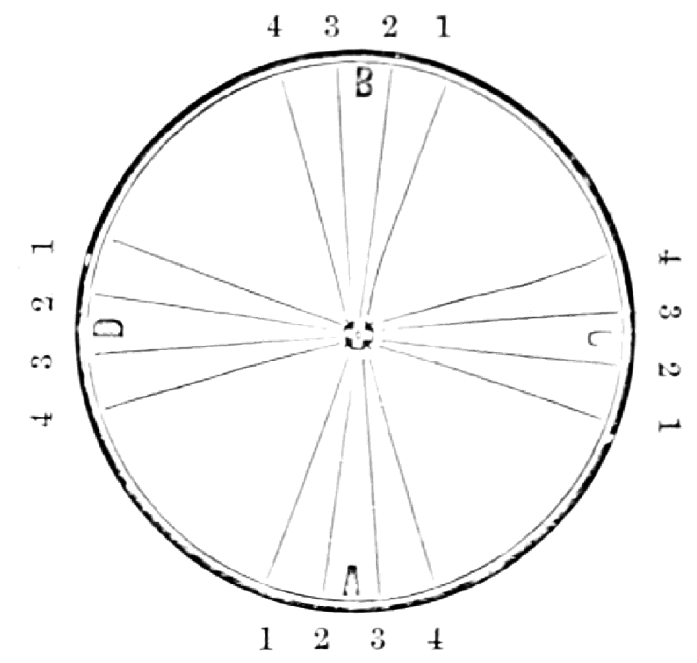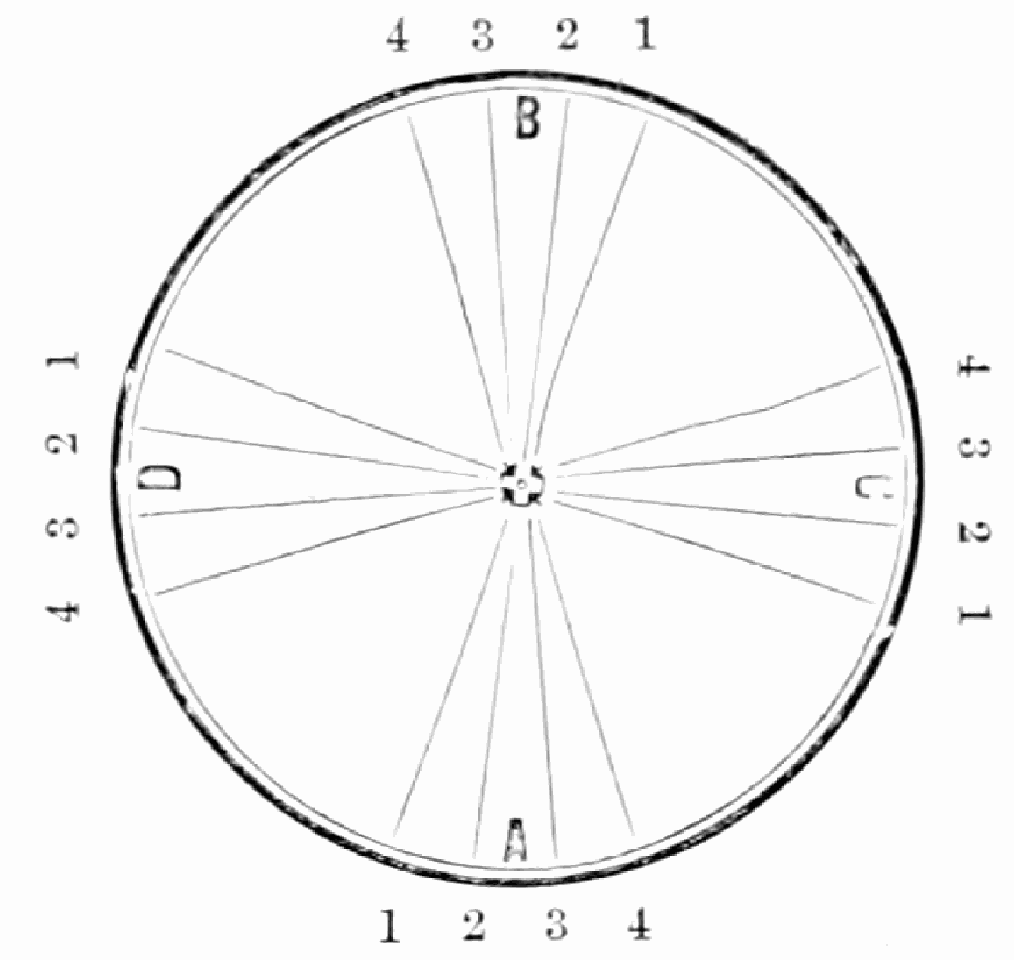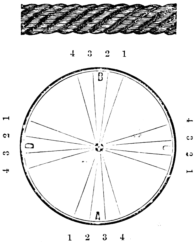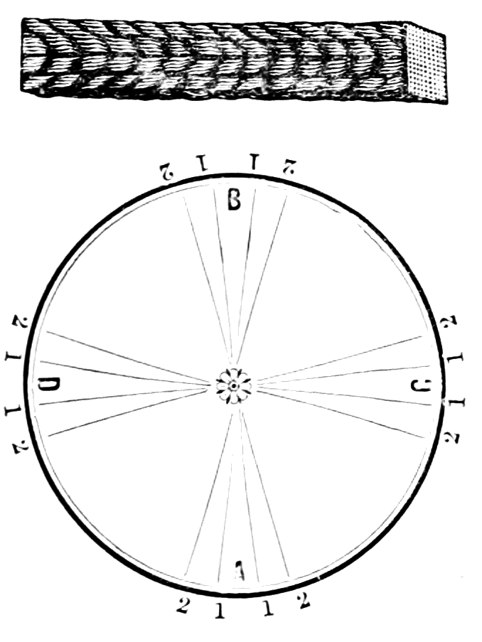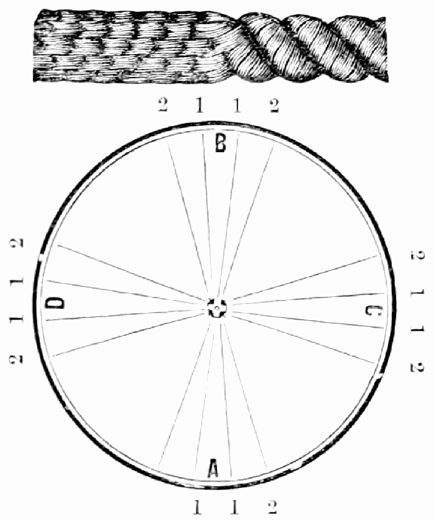 Take sixteen strands, seventy-five hairs in a strand, and place on the table like pattern. Commence at A take Nos. 1 and 2, lift across the table to B, and lay No. 1 outside of No. 4, and lay No. 2 between Nos. 1 and 2, and bring back Nos. 1 and 2 from B to A, and lay No. 1 outside of No. 4, and No. 2 outside of No. 1 at A; then go to C and take Nos. 1 and 2, lift over table to D and lay No. 1 outside of No. 4, and lay No. 2 between Nos. 1 and 2, and bring back Nos. 1 and 2 from C, and lay No. 1 outside of No. 4, and No. 2 outside of No. 1 at C; then go to B and change the same, and so on around the table to the right until the braid is finished.