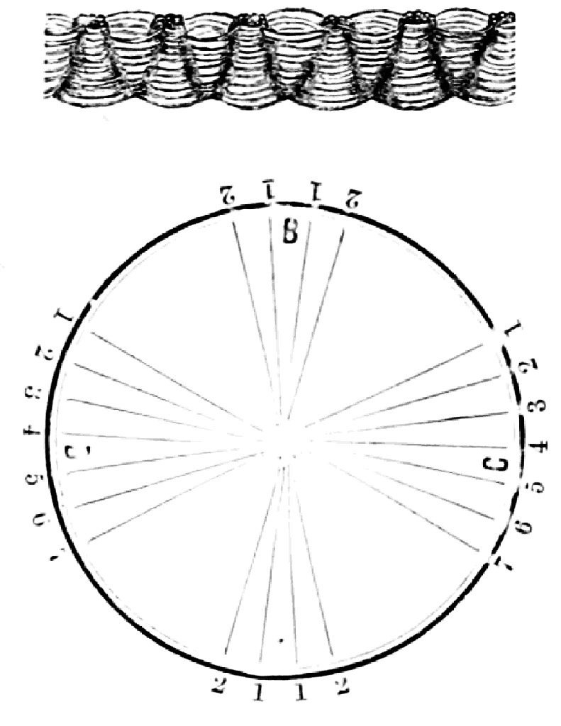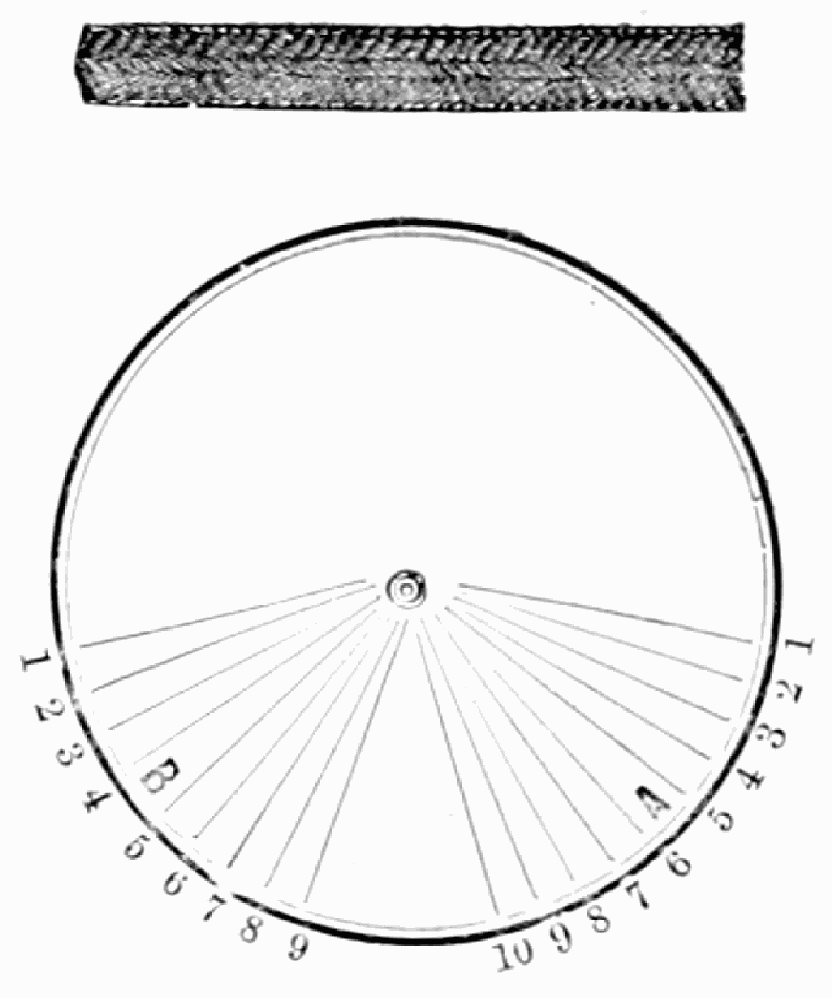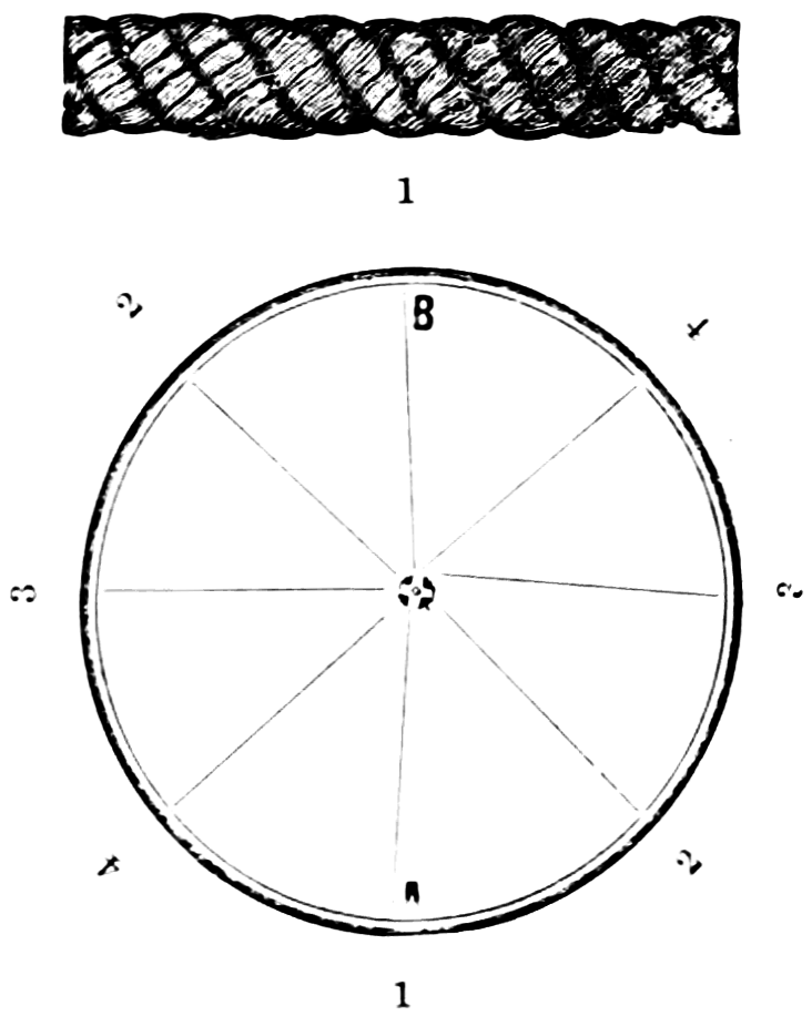 Take any number of strands that can be divided by two, eighty hairs in a strand, twenty strands for usual size, place on table like pattern. Commencing, take No. 1 at A in right hand and No. 1 at B in left hand, and swing around the table to the right, and lay the one in right hand at No. 1 at B, and the one in left hand at No. 1 at A; then bring back No. 2 at B with right hand, and No. 2 at A in left hand, to the left, then take No. 3 and swing to the right, then No. 4 and swing to the left, so on, round first to the right then to the left, with every number of strands till you get to No. 1; then commence as at first, and so on till the chain is as long as required.