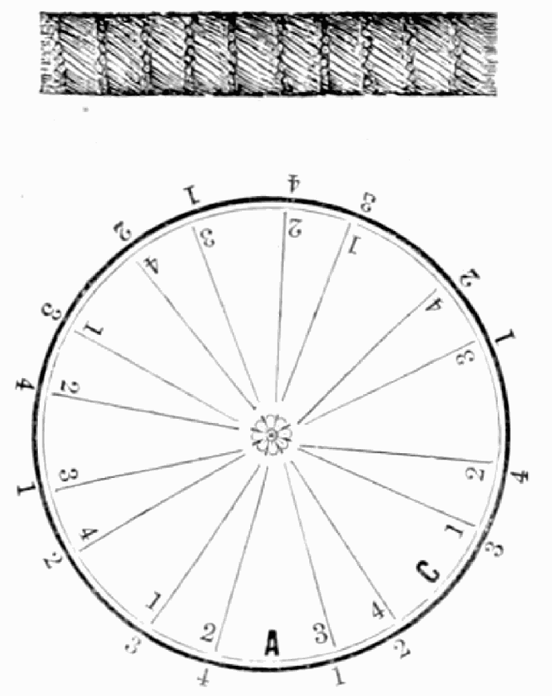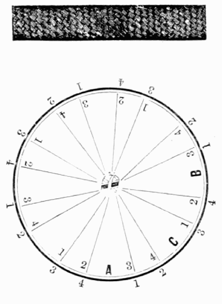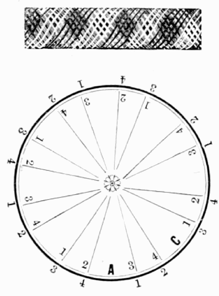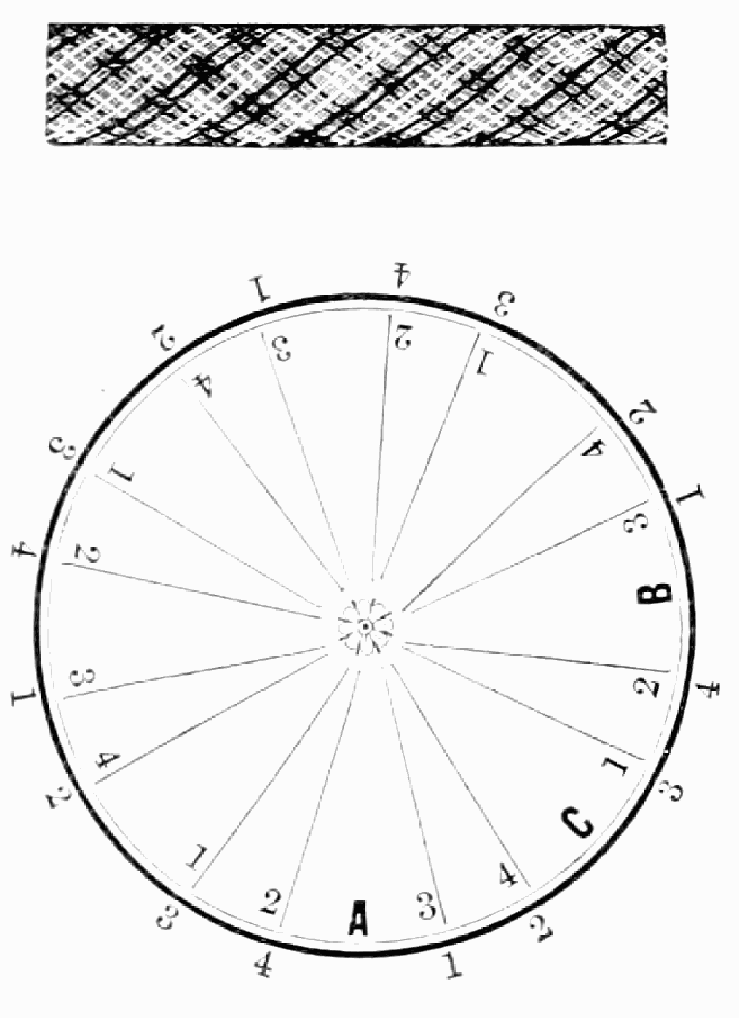 Take thirty-two strands with twelve hairs in a strand, or any number that can be divided by four, and sixty strands for usual size, and place them on table like pattern. Have every alternate two strands of black hair, and the others of light hair. Commence at A, taking two strands of light hair in left hand, Nos. 1 and 2, and take two strands of black hair in right hand, Nos. 3 and 4, and cross No. 2 (light) over No. 3 (dark), then No. 1 (light) under No. 3 (dark), then No. 4 (dark) over Nos. 1 and 2 (light); so on around the table to the right until you get to A; then commence and work back to the left by taking light hair in left hand and dark hair in right hand, as before, and put No. 3 (dark) over No. 2 (light), and No. 4 (dark) under No. 2 (light), and No. 1 (light) over Nos. 3 and 4 (dark), so on around the table till you get to A; then commence as at first, so on, braiding first one way around the table then the other till you have the chain completed.