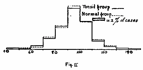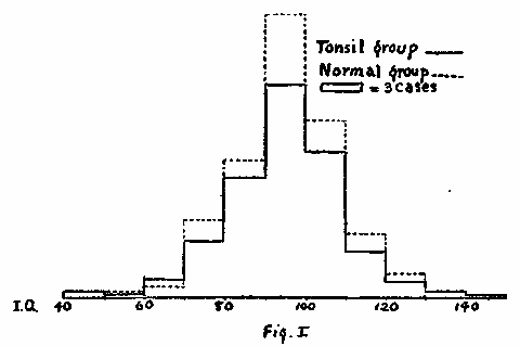 But it is not my purpose to discuss the question of the efficacy of removing adenoids and tonsils. The aim of this study is, rather, to determine experimentally whether or not there exists any causal relation between defect in this respect and lowering of intelligence level. One hears statements made both pro and con by physicians and laymen but there has been little experimental proof. It would seem to be rather useful for a physician to know in advance with how much probability of correctness he is speaking, when he advises a mother that the removal of adenoids and tonsils from the throat of her backward child will make him "bright." The question in the present case, however, is broader than that of relation between these afflictions and mental defect. We are inquiring not merely whether adenoids and tonsils are causes of sub normality or dullness, but also whether they tend to lower the intelligence quotient in general however high it may be. Would the mentally normal child with adenoids and tonsils have been superior without them, and would the superior child have been still more superior? What is the relation between adenoids and tonsils, and intelligence?