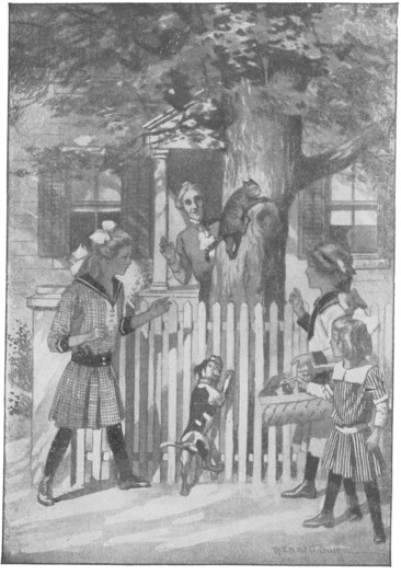 As Tess and Dot came down the littered stoop of the tall brick house they lived in, a rosy, red-haired boy, with a snub nose and twinkling blue eyes, suddenly popped up before them. He was dressed in fringed leggings and jacket, and wore a band of feathers about his cap.