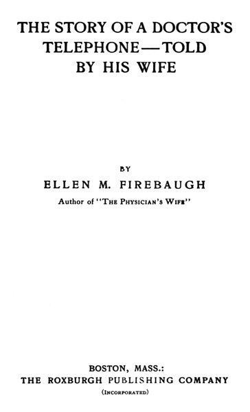 The Project Gutenberg EBook of The Story of a Doctor's Telephone--Told by His Wife, by Ellen M. Firebaugh This eBook is for the use of anyone anywhere at no cost and with almost no restrictions whatsoever. You may copy it, give it away or re-use it under the terms of the Project Gutenberg License included with this eBook or online at www.gutenberg.org Title: The Story of a Doctor's Telephone--Told by His Wife Author: Ellen M. Firebaugh Release Date: February 3, 2012 [EBook #38752] Language: English Character set encoding: UTF-8 *** START OF THIS PROJECT GUTENBERG EBOOK A DOCTOR'S TELEPHONE *** Produced by Norbert H. Langkau, Jana Srna and the Online Distributed Proofreading Team at http://www.pgdp.net (This file was produced from images generously made available by The Internet Archive)