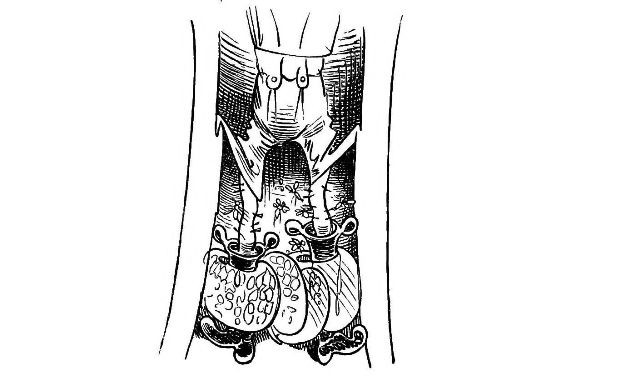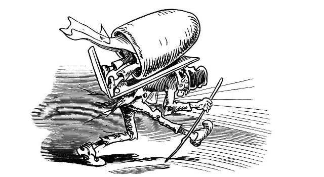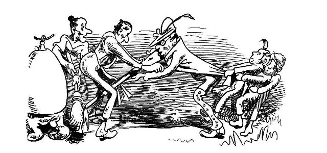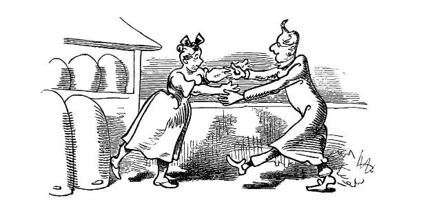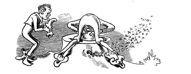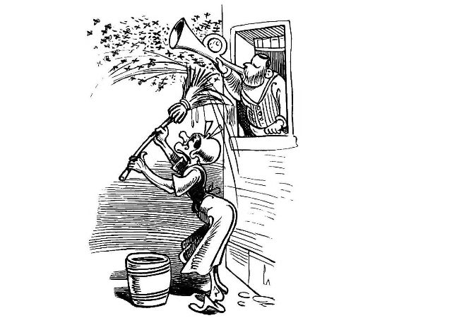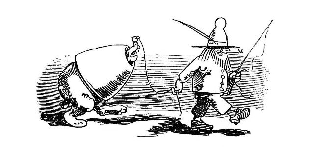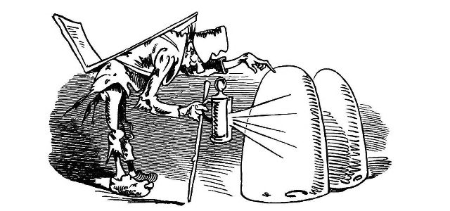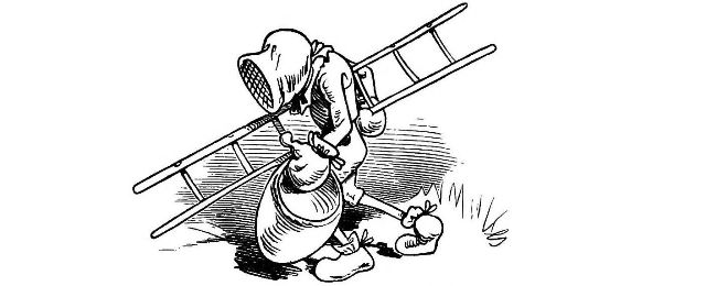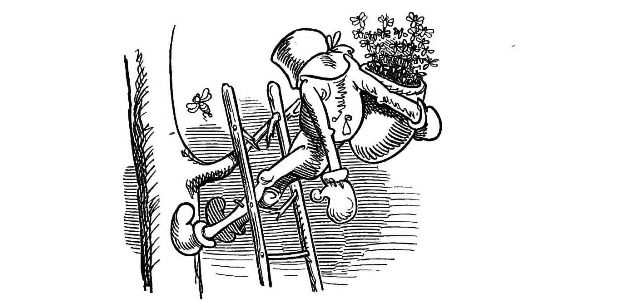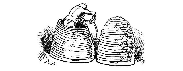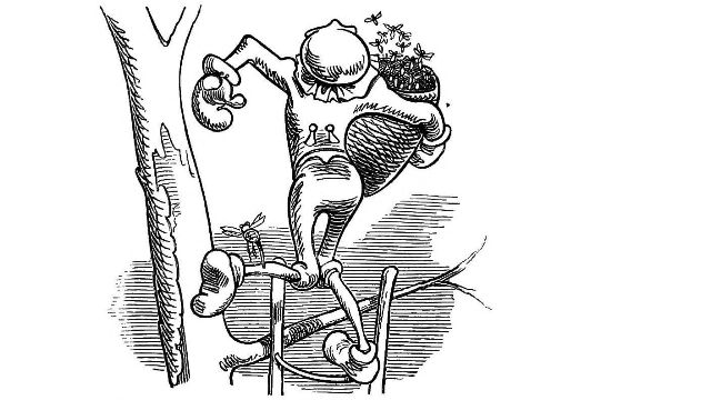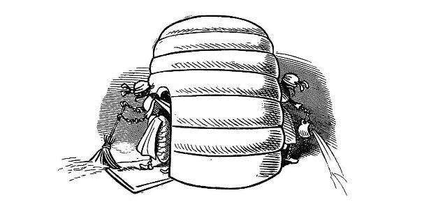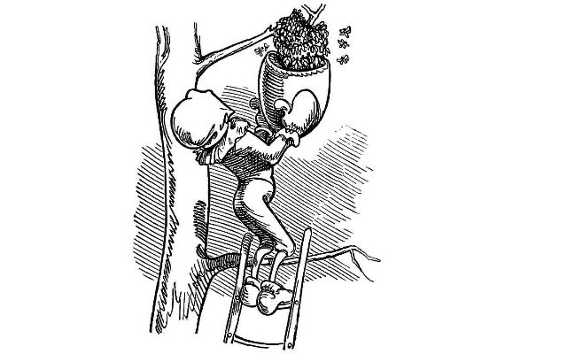 "Fetched His Bee Dress, his Hive, his Ladder."—Page 23.—A veritable Guy Mr. Dull looks in his defensive armour! A simpler and equally efficient dress may be made of a black net bag, large enough to be drawn over a straw or felt hat, with a brim sufficiently wide to keep the net away from the prominent organ, the[Pg 76] nose, and long enough to be buttoned into the Bee-master's coat. A couple of elastic bands round the wrists will prevent the Bees crawling up his sleeves, the same round the ancles will secure the most timorous Bee master. "A Lady's dress I cannot pretend to regulate." See "My Bee Book," where many instances of the effect of stings are given. When swarming, Bees are particularly gentle, and never sting, except when some are crushed. A true Bee-master will despise such defensive armour, but trust rather to his gentleness and knowledge of the habits of his Bees for his immunity from stings. Should he be stung, nevertheless, in spite of all precautions, let him instantly extract the sting, and apply a drop of honey to the place. This will immediately allay the smarting pain, and the swelling, except in certain places, as the eye or lip, be trifling. Eau de Luce as it is commonly called, that is, strong ammonia, is another excellent remedy; a small bottle should be kept in every apiary in the box of "needments." But above all, let the Bee-master eschew gloves, specially when delicate operations are to be performed. A cat might as soon expect to catch mice in mittens, as a Bee-master to capture a Queen with hands encased in, and fingers stiffened by, thick woollen gloves, as recommended by some.