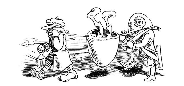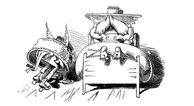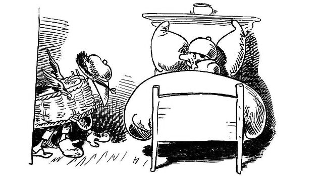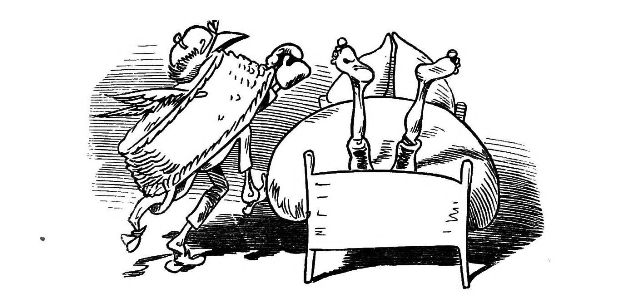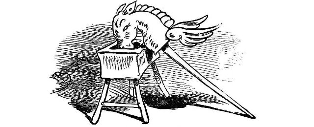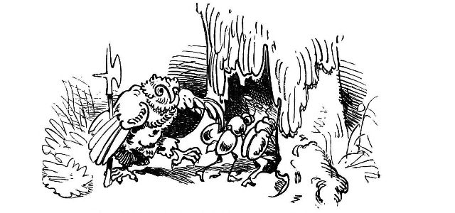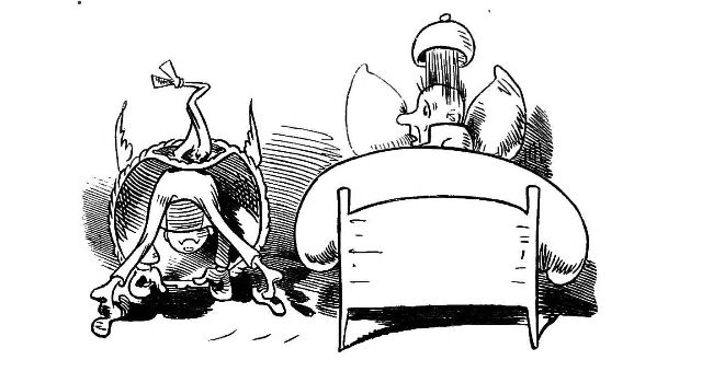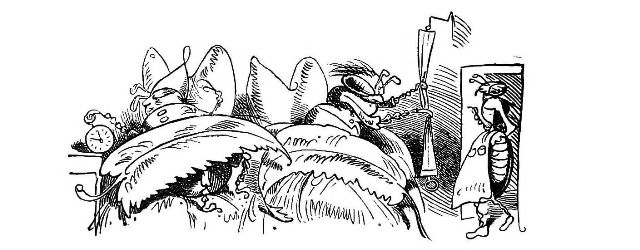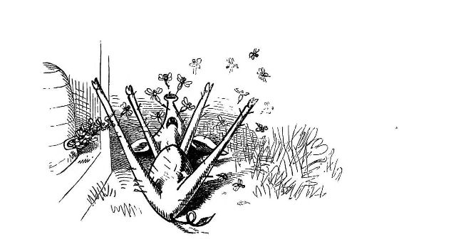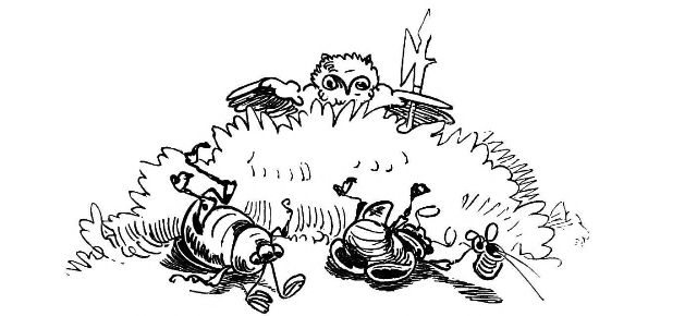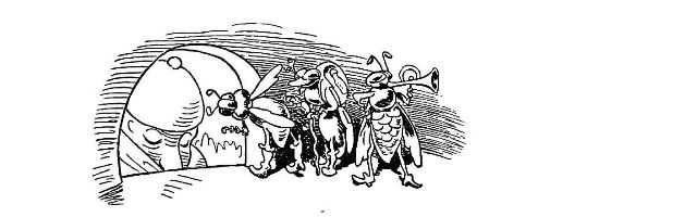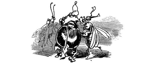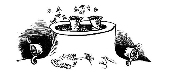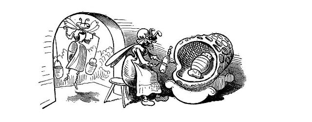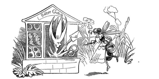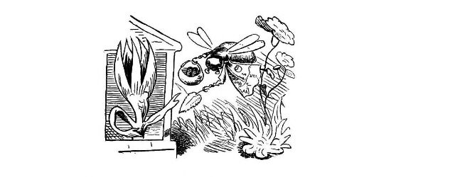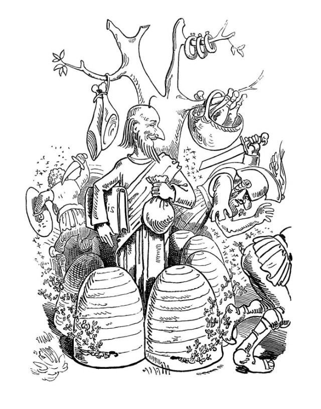 Fytte I.—Page 1-7.—The fun of this first Fytte will be "real nuts" to every Bee-master. The whole economy of a Hive is viewed from a human stand-point. The sentinels watching with their own stings in their hands as lances; the early labours of the chamber and house maids; the architects setting out the day's work; the swaddling clothes and pap boat for the Grub Royal; the State of the Queen; the idleness of the drones: all is well told, at least in the wood cuts.