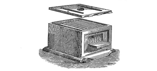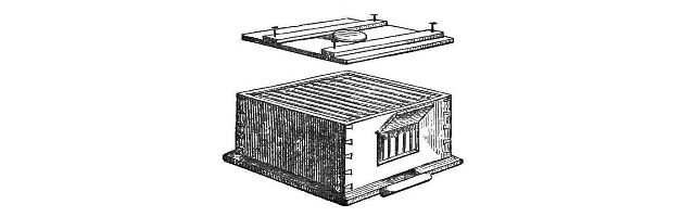 "Some way I'll find to stop this Swarming."—Page 29.—It is not to be done by monster hives, or ventilation, or by adding supers. If the Bees will swarm, they will. They are a stiff-necked generation, and know their own business, at least they think so, better than we men can teach it them. Our objects, however, are slightly different. Their's to propagate and preserve their species: ours to secure the maximum amount of honey in any given locality. I have known a swarm sent forth from a Ruche a l'air libre, a French Hive, which I worked in New Zealand. The Combs and Bees were entirely exposed to the external air, which was not then particularly warm. But a swarm was ready to go, so off they went. For full particulars of this remarkable instance see "My Bee Book," second edition. To regulate, not to prevent swarming should be the Bee-master's aim. More of this hereafter. I here give, by the kindness of Mr. Alfred Neighbour, illustrations of the sort of hive by which alone this can be accomplished, viz., the Bar Frame hive. Originally of German invention, it, with various modifications, has been widely adopted both on the Continent and in America; and every Bee-master in England who claims the title of scientific, would do well to supply himself at once. Each honey comb, it will be seen, is built in a separate bar frame like a picture. [Pg 77]They are ranged to the number of 9, 11, or 13, in a strong box, and each is both moveable and interchangeable with those of any other hive. Swarming may be checked in any particular stock by cutting out the Queen Cells. The great production of drones can be regulated by limiting the amount of drone cell in any hive, and altogether prevented by removing it all from a stock hive, about the purity of whose strain there is the least doubt; whilst again, it may be encouraged in a pure blooded stock hive, by inserting at the proper time an additional bar containing drone comb. Any man handy with tools may make them for himself at the cost of the materials, and they will last a lifetime. I can supply [Pg 78]my friends with as many as they require at half a guinea, for which they pay double or treble in the shops; whilst those who think nothing can be good except it is high-priced, and do not like the trouble of making their own hives, may go to any cost they like. The preceding woodcut represents a hive on this principle, but with certain modifications, which may be obtained of Mr. Neighbour, 149, Regent-street, and will suit the class of Bee keepers last mentioned. Mr. Neighbour has, I may mention, made arrangements for supplying Ligurian Queens of the greatest purity.