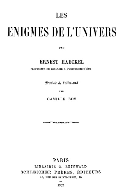 Le livre que l'on va lire sur les Enigmes de l'Univers est un complément, une confirmation, un développement des convictions exposées dans les ouvrages ci-dessus, indiquées et défendues par moi depuis un nombre d'années qui représente déjà la durée d'une génération. Je me propose de terminer par là mes études de philosophie moniste. Un vieux projet nourri pendant bien des années, celui d'édifier tout un système de philosophie moniste sur la base de la doctrine évolutionniste, ne sera jamais mis à exécution. Mes forces ne suffisent plus à la tâche et bien des symptômes de la vieillesse qui s'approche me poussent à terminer mon œuvre. D'ailleurs je suis, sous tous les rapports, un enfant du XIXe siècle et je veux, le jour où il se terminera, apposer à mon travail le trait final.