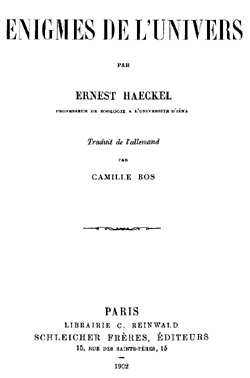 Comme mon Monisme diffère essentiellement de celui du président berlinois, comme, d'autre part, la façon dont celui-ci conçoit les «sept énigmes de l'Univers» a trouvé le plus grand succès et s'est propagée dans tous les milieux, je considère comme opportun de prendre de suite et nettement position vis-à-vis de mon adversaire.