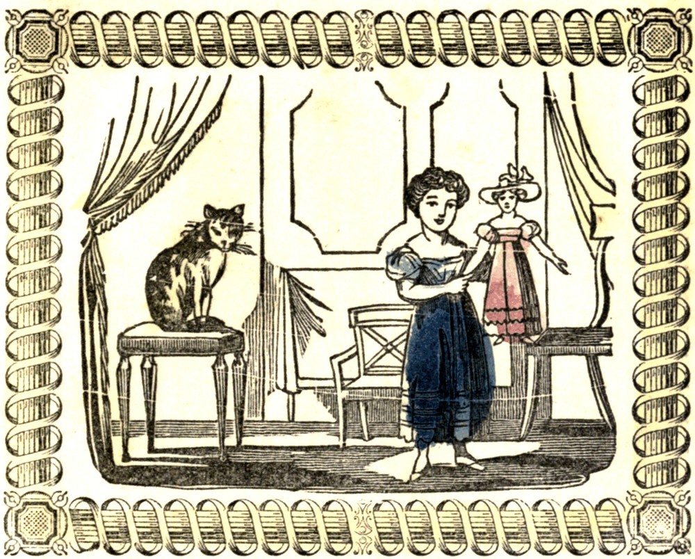 Miss Charlotte is well pleased with the Doll her aunt gave her. She has already made several new dresses for it. See how delighted she appears as she holds it up.