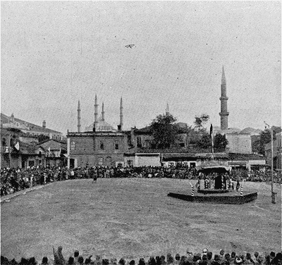 Une fois leurs soldats réinstallés à Andrinople, le premier soin des Ottomans fut de consacrer cérémonieusement cette reconquête. Il y eut, le 29 juillet, en faveur de la domination turque, ce meeting monstre dont nous avons parlé dans notre dernier numéro. Le prince héritier de Turquie, Youssouf Izeddine, fils du sultan, et son frère Djemal Eddine vinrent en grande solennité dans la ville reprise et accompagnés du généralissime Izzet pacha, ministre de la Guerre, de Hurshid pacha, commandant d'armée, et d'Enver bey, passèrent en revue les troupes de la garnison.