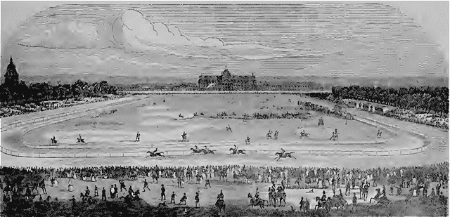 L'Illustration a saisi le moment où va être donné le signal du départ pour le grand prix royal. Tout le monde est à son poste; on aperçoit la tribune du jockey-club, les juges et les coureurs. Jenny est confondue dans la foule, mais bientôt elle en sortira: elle sera victorieuse.