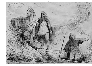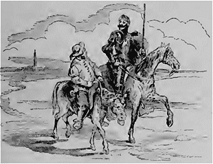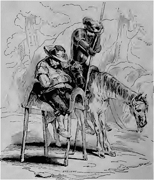 Mais la vie champêtre convient-elle à un tel héros? Don Quichotte a bientôt repris le fer, la cuirasse et l'armet de Membrin. Qu'il fait beau le voir sur son Rossinante immobile, tandis que Sancho Pança enfourche le bât de son âne, en attendant le fidèle baudet qui broute quelque part l'herbe fleurie.