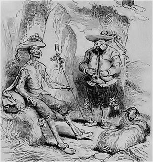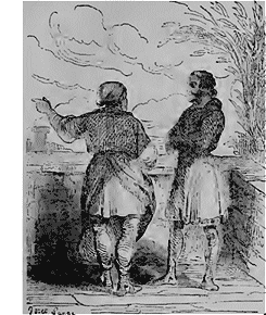 Plus loin, don Quichotte devient la victime de sa philanthropie et de sa candeur; vous savez comme quoi, au détour d'un buis, le valeureux chevalier rencontra une bande de forçats escortée d'une escouade de la sainte hermandad. «Holà! oh! seigneurs cavaliers, rendez la liberté à ces malheureux, s'écria-t-il, ou je vous pourfends de ma redoutable épée!» Et aussitôt, piquant des deux et croisant la lance, don Quichotte mit les gendarmes en pleine déroute et délivra les bandits, qu'il prenait pour des esclaves opprimés. Ce qu'il en advint, vous le voyez; à peine les forçats ont-ils brisé leurs chaînes, qu'ils se tournent contre leur libérateur, le jettent bas et le rouent de coups, de compagnie avec Sancho.