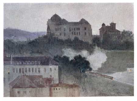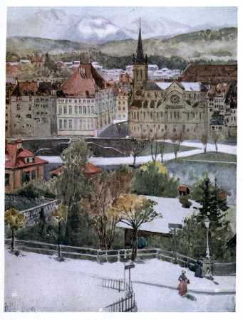 The seat of the Swiss Government. The Rathhaus, a modern "old Catholic church," in centre of picture. The Bernese Oberland Mountains in heat-haze at top.