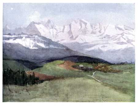 JOHN RUSKIN, in a fine and famous passage, describes the effect of a first view of the Alps upon a young and sensitive mind. He was at Schaffhausen with his parents. "We must have spent some time in town-seeing," he writes, "for it was drawing towards sunset when we got up to some sort of garden promenade—west of the town, I believe; and high above the Rhine, so as to command the open country across it to the south and west. At which open country of low undulation, far into blue—gazing as at one of our own distances from Malvern of Worcestershire, or Dorking of Kent,—suddenly—behold—beyond! There was no thought in any of us for a moment of their being clouds. They were clear as crystal, sharp on the pure horizon sky, and already tinged with rose by the sinking sun. Infinitely beyond all [2] that we had ever thought or dreamed,—the seen walls of lost Eden could not have been more beautiful to us; not more awful, round heaven, the walls of sacred Death. It is not possible to imagine, in any time of the world, a more blessed entrance into life, for a child of such a temperament as mine."