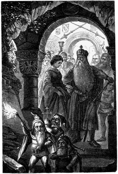 The Emperor struck the stone with his sword, so that a loud echo answered from the hollow interior. Then the rocky door opened, and Barbarossa and his faithful warriors entered the spacious hall of the Kyffhäuser Mountain. The rock had not long closed behind them when a gentle tapping was heard, the magic gate swung open, and the lovely Gela entered, arrayed in bridal attire as she had been laid in the tomb.