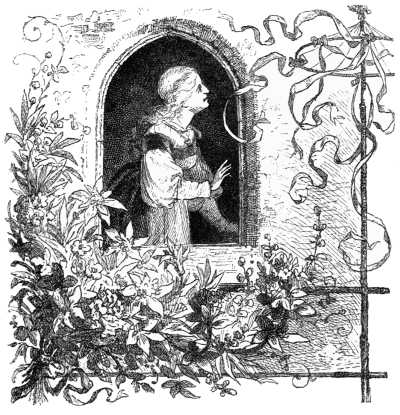 The butler placed a goblet of the richest wine on the table, a drink of honour which he kept carefully in the driest corner of the cellar for the greatest occasions; and Dame Barbara, the housekeeper, brought in proudly the delicious pastry which she had prepared for this festive day; but the young duke gave no heed to these attentions. He stood in the oriel window, and looked down at a little lattice in the buildings that surrounded the castle court. There, in a green window-box, gillyflower and rosemary used to bloom, and behind them he often had watched a face bent over the spinning-wheel—a face that he had not found surpassed by any even among the Flowers of the East.