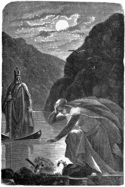 She passed out, and her sorrowing guests followed her275 to the door. Without once looking back, she glided away through the leafless trees; her blue robe gleamed far away over the snow-covered plain. Orm and Aslog watched her crossing the waves to the little islands; then they saw her no more.