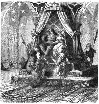 Below there was rattling of dishes and the patter of many feet; the young couple heard every sound through the wide chimney. The strong voice of the rock giant sounded like thunder to human ears, and the voice of the lady, which Orm and Aslog had heard once before, was like the powerful notes of some musical instrument.270 Tables and chairs were moved, drinking-horns were knocked together; the feast was beginning, and now was heard once more that music which had before so overwhelmed Aslog with delight. Then an irresistible longing seized her to see the wondrous company which Orm had described to her. She rose and groped for a crack in the floor through which it was possible to see into the room below. Orm in silence held out his hand to check her fatal rashness, but the movement woke the sleeping babe, who, terrified by the unwonted sounds below, raised a cry that went to the mother's heart. Forgetting everything now but her child's distress, she began, as was her wont, to soothe him with caressing words. Then suddenly an awful cry and a wild tumult arose below, the music ceased, and through the door rushed the dwarfs in wild commotion. Their torches went out, the noise of their flight sounded but a few moments, then night and silence reigned over the place which a minute before had resounded with festive merriment.