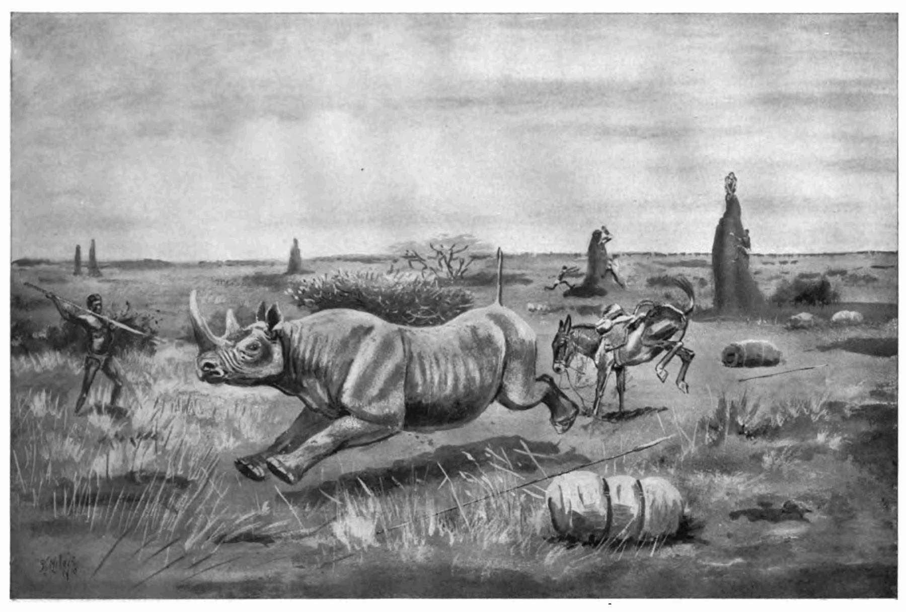 Return to South Africa—Intends to be an ostrich farmer—Goes north again—The snake-stone—Collecting specimens of big game and butterflies—A bold lioness—Visit to Khama—Lion attacks the camp—Death of the lion—Laer's narrow escape—Kills a leopard—Reaches the Zambesi—Goes south and then returns to Mashunaland—The Manyami plateau—A savage leopard—Adventure with a lion—The hippopotamus row—A poor outlook—Visit to the Mababe—A man-eating lion—Return to Bulawayo—The white rhinoceros—A wonderful herd of elephants—A great day spoiled by a sulky horse—Frequently charged by elephants—A savage cow—Curious magnanimity to a horse—Liechtenstein's Hartebeest—A gallant sable antelope—Havoc amongst the dogs—Danger from wounded sable and roan antelopes