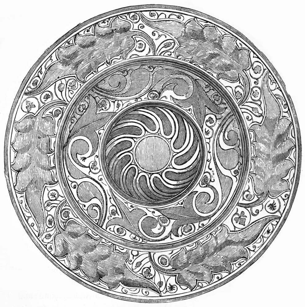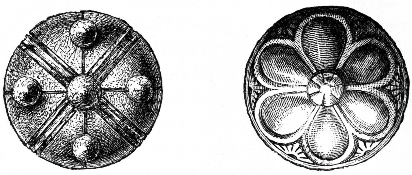 One example will be enough to prove this. Setting apart the famous cloisonné pectorale at the Boulac Museum, Cairo, and other jewels of the queen, Aah-Hotep, 17th century B.C.; the hawk of a similar period, Louvre Museum (Paris), and a number of analogous objects in the British Museum, we have enough specimens of this kind to show that cloisonné work was known in the east from the very earliest period. I will draw especial attention to the plaque in the Museum of Wiesbaden, found at Wolfsheim in 1870. It is formed of gold, with a circular and triangular ornamentation and squares, découpés à jour, set with jacinths, or red glass paste. At the back may be read an inscription in Persian characters, which gives the name of a Sassanide king, Artachshaber, of the 3rd century of our era. (See A. von Cohausen, "Roemischer Schmelzenschmuck," Wiesbaden, 1873). I know no more ancient specimen in the north of Europe of these jewels with coloured stones, nor can I give a better example of their oriental origin. Those who may wish to make a more profound study on this subject, can also examine the interesting jewels with stones found at Petrossa, Wallachia, in 1835, now in the Museum of Bucharest. They are attributed to the Visigothic King Athanaric, who lived towards the middle of the 4th century of our era, and are considered in the present day of undoubted Sassanide origin.