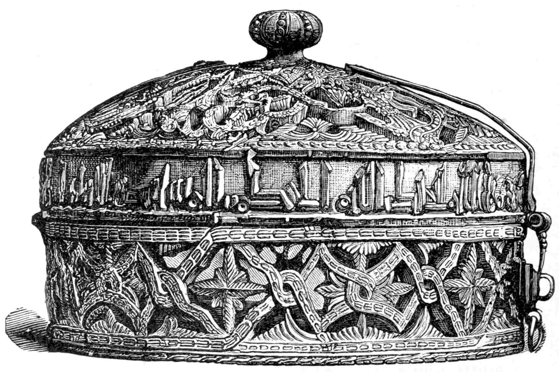 The border of some of these crowns is formed of a net-work of small gold massive balustrades; having between them square spaces in which pearls and sapphires are set. Others are made simply of repoussé gold, their chief interest consisting in the ornamentation which has been so artistically carried out. Some of them have inscriptions and a few stones set at intervals. The pendants from these crowns are inferior in richness to the others already described. The pendent crosses are ornamented in the same style, either with cloisonné work or repoussé inscriptions.
