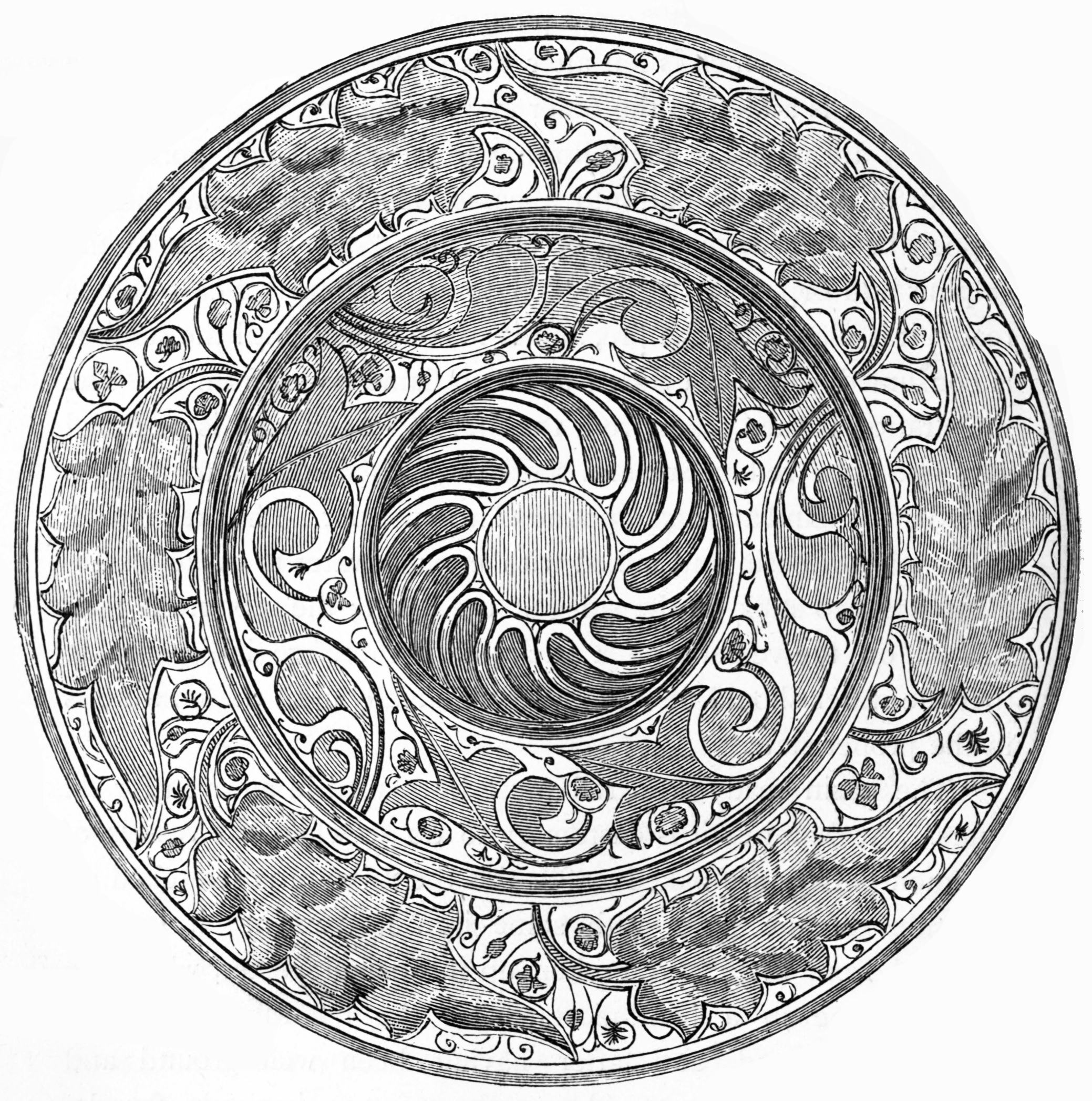 The information and remains which have reached us illustrating silver and gold work of the Roman domination are more important; we find, however, in this and similar artistic industries that, as a general rule, the Romans imposed their style and system on the inhabitants of the countries which they conquered, and it is not easy to point out any one example which can be given as an exception to this general rule. It is, undoubtedly, a fact that objects of all kinds in gold and silver were used in Spain to a very great extent—for, notwithstanding the destruction of ages, we still possess inscriptions which allude to silver statues, and a large number of objects in the precious metals exist in museums and private collections. See "Inscrip. Hisp. lat.," by Dr. Emile Hübner, Berlin, 1869. Of these it will be sufficient to mention one of the most important. It is known in the province of Santander by the name of the dish of Otañez; and belongs to a gentleman who lives in that locality. It was found at Otañez at the end of the last century, buried in a stone quarry. This dish is made of silver, it weighs thirty-three ounces, and is covered with an ornamentation of figures in relief, some of which are gilt, representing an allegorical subject of the source of medicinal waters. In the upper part is a nymph who pours water from an urn over rocks; a youth collects it in a vessel; another gives a cup of it to a sick man; another fills with it a barrel which is placed in a four-wheeled car to which are yoked two mules. On each side of the fountain are altars on which sacrifices and libations are offered. Round it is the inscription: SALVS. VMERITANA, and at the back is engraved, in confused characters, the words: L. P. CORNELIANI. PIII....