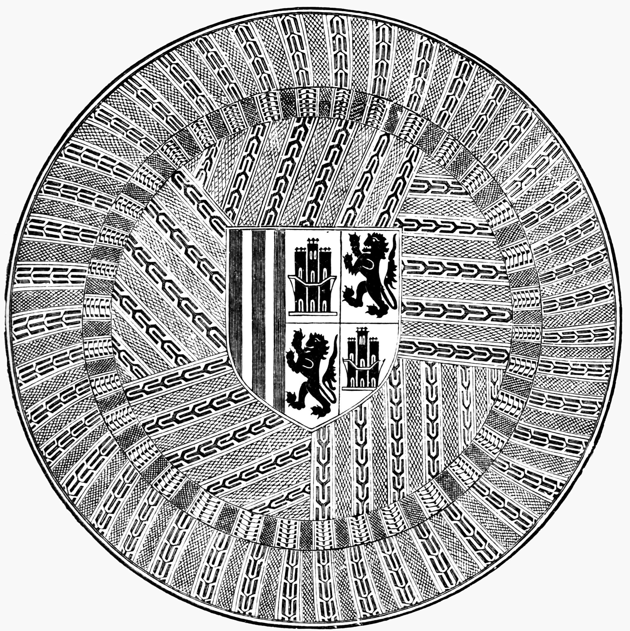 Another very interesting silver dish may be seen at the Academia de la Historia, Madrid. Although not of Spanish manufacture, it deserves special notice in a description of works of this style. This dish was found in 1847, buried in a field at Almendralejo, province of Estremadura: it is 28-6/8 English inches in diameter, and weighs 533 ounces. It is ornamented with fine figures in relief, representing the Emperor Theodosius appointing a magistrate. The emperor is seated on his throne in the centre, at the sides are his sons Arcadius and Honorius, with four soldiers of the guard, and the magistrate, who receives the volume. In the lower part there is an allegorical representation of a nymph holding the horn of abundance, winged angels, and ears of wheat, probably alluding to the abundance and plenty of the empire. Round the rim is the following inscription:—