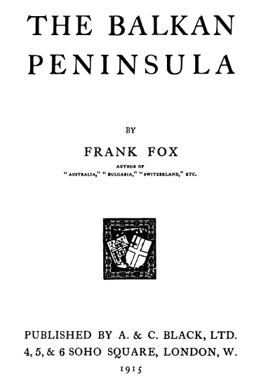 The Project Gutenberg EBook of The Balkan Peninsula, by Frank Fox This eBook is for the use of anyone anywhere at no cost and with almost no restrictions whatsoever. You may copy it, give it away or re-use it under the terms of the Project Gutenberg License included with this eBook or online at www.gutenberg.org/license Title: The Balkan Peninsula Author: Frank Fox Release Date: May 13, 2012 [EBook #39688] Language: English Character set encoding: ISO-8859-1 *** START OF THIS PROJECT GUTENBERG EBOOK THE BALKAN PENINSULA *** Produced by Bruce Albrecht, Margo Romberg and the Online Distributed Proofreading Team at http://www.pgdp.net