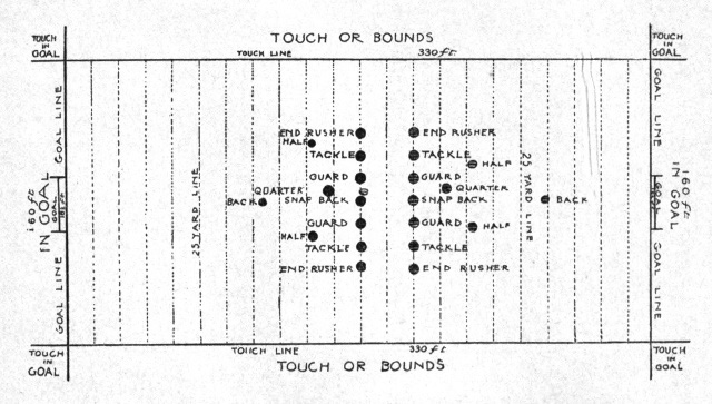 The instructions to the end are to handle the ball as much as possible while the opponent is endeavoring to get it in, and thus make the work of that individual as difficult as possible; and, secondly, to plant one foot close to the touch line and the other as far out into the field as is consistent with stability, and to maintain that position until the play is over. He must neither try to go forward nor around, but, braced well forward, hold his ground. If he does this, no runner can pass within three feet of the touch line, and outside of that the tackle can take care of him. This player, like the end, should, when the ball is played from a fair, be very loath to plunge forward until the play is located, because in the present stage of development of the game one can be quite sure that the opponents will not play the ball from touch unless they[Pg 36] have some definite and usually deceptive line of action. Without such it is by far the better policy to walk out the fifteen paces and have it down. The quarter-back also has work to do upon side-line plays, in assisting at the edge as much as possible. But to return to the end. When his own side have possession of the ball, his play, like that of any other man, must be governed by the character of the intended move, and the knowledge of what this move will be is conveyed to him by the signal. The nearer the play is to his end, the greater is the assistance he can render. There is little need of coaching him to do his work when the run is along his line, nor, in fact, when it is upon his side of the centre. The knowledge of the proximity of the runner stirs him up sufficiently, if he have any football blood in him. The point towards which coaching