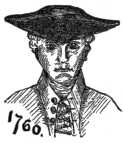 Departure from settled and accustomed styles created the same furore and astonishment, and subjected the venturesome individual whose inclinations led an advance in fashion to the same exposure to ridicule as affects the "swell" of the present day, and the reporters of "society doings" then were as close observers, as keen in wit, and as unmerciful in criticism as any of their kin to-day. Planché, quoting from the London Chronicle for 1762, refers to fashion of hats at that time as follows: "Hats," says the writer, "are now worn on the average six and three-fifths inches broad in the brim and cocked. Some have their hats open like a church spout or like the scales they weigh their coffee in; some wear them rather sharp like the nose of the greyhound, and we can designate by the taste of the hat the mood of the wearer's mind. There is a military cock and a mercantile cock, and while the beaux of St. James wear their hats under their arms, the beaux of Moorfields-Mall wear theirs diagonally over the left or right eye; sailors wear their hats uniformly tucked down to the crown, and look as if they carried a triangular apple pasty upon their heads."
