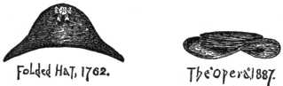 The folded hat of 1762 differed from the opera hat of the present day also in the softness of the crown, permitting its being flattened, and the brim, as if hinged front and rear, folded at the sides like the corners of a book, while the present opera hat, constructed with jointed springs, allows its cylindrical crown to be flattened down to a level with the brim, which keeps its fixed shape.