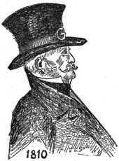 From the year 1750 until after the Revolution there was but little change in the general character of style in men's hats: the custom of erecting the brims by tying or looping them up prevailed. Soon the elevation of the brim of 1750 was abandoned and a change made by looping it at the points of a triangle, producing the three-cornered or "cocked" hat. This was a becoming style we must admit, and one seemingly well suited to the independent, fearless and patriotic characteristics of our forefathers' traits, the possession of which at that time gave us all the comforts that are ours now. The "cocked" hat enjoyed a long popularity, continuing in fashion until near the close of the century, when the "steeple top" and "chimney pot" styles—slang terms for the high beavers—came into vogue, a style which Ashton, an English writer, designates as "the11 hideous head-covering that has martyrized at least three generations."