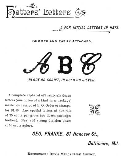 Identical with the interests of Baltimore were the industries of other towns of the colony of Maryland, and among the earliest records referring to the hat business are several advertisements found in the Maryland Gazette, published at Annapolis. In February, 1760, Chas. Diggs advertises "men's and boys' castor and felt hats." In 1761 Barnet West advertises14 "gold and silver band hats, just imported from London," and in April, 1761, appears the advertisement of Nathaniel Waters, of Annapolis, who announces that he has for sale "silver and gold buttons and loops for hats, and that he carries on the hat-making as usual."