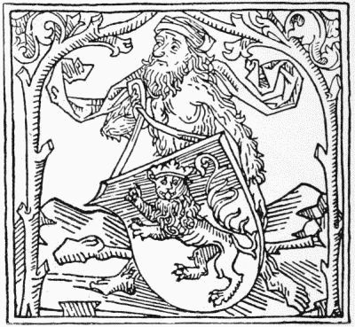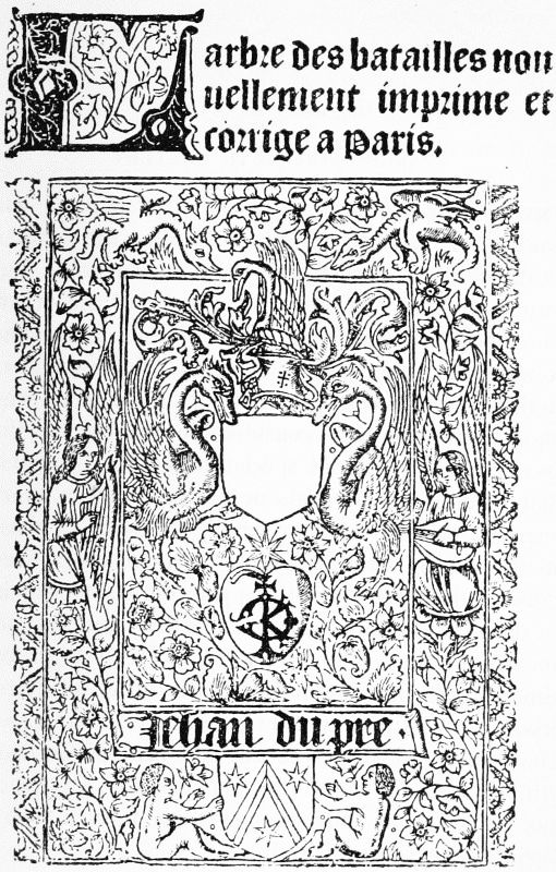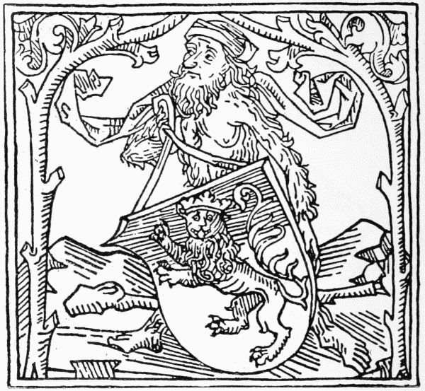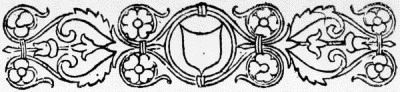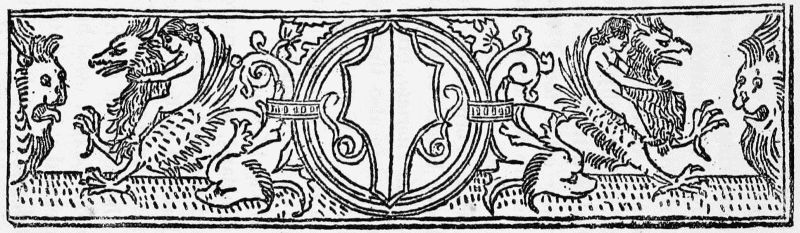 The use of illumination in printed books was a natural and pleasing survival of the glories of the illuminated manuscript. Its discontinuance was in part a sign of health as testifying to the increased resources of the printing press; in part a symptom of the carelessness as to the form of books which by the end of the seventeenth century had become well-nigh universal throughout Europe. So long as a few rich amateurs cared for copies of their favourite authors printed on vellum, and decorated by the hands of skilful artists, a high standard of excellence was set up which influenced the whole of the[Pg 20] book-trade, and for this reason the revival of the use of vellum in our own day may perhaps be welcomed. It may be noted that the especially Italian custom of introducing the arms of the owner into the majority of illuminated designs left its trace in the blank shields which so frequently form the centre of the printed borders in Italian books from 1490 to 1520. Theoretically these shields were intended to be filled in with the owner's arms in colour, but they are more often found blank. Two examples of their use are here shown, one from the upper border of the Calendar, printed at Venice in 1476 (the first book with an ornamental title-page), the other from the lower border of the first page of text of the Trabisonda Istoriata, printed also at Venice in 1494. We may note also that the parallel custom of inserting the arms of the patron to whom a book was dedicated was carried on in Spain in a long series of title-pages, in which the arms of the patron form the principal feature.