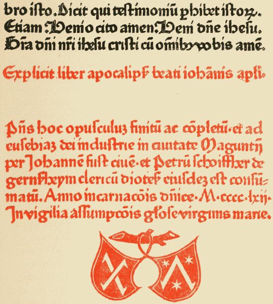 We have already noted how the anxiety of the earliest Mainz printers to rival at the very outset the best manuscripts with which they were acquainted, led them to anticipate improvements which were not generally adopted till many years afterwards. Among these we must not reckon the[Pg 24] use for the rubrics or chapter headings of red ink, which appears in the trial leaves of the 42-line Bible, and was to a greater or less extent employed by Schoeffer in most of his books. Although red ink has appeared sporadically, and still does so, on the title-page of a book here or there, more especially on those which make some pretence to sumptuousness, its use in the fifteenth century was a survival, not an anticipation. For legal and liturgical works it was long considered essential; for other books the expense of the double printing which it involves soon brought it into disfavour and has kept it there ever since.