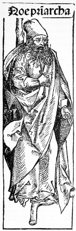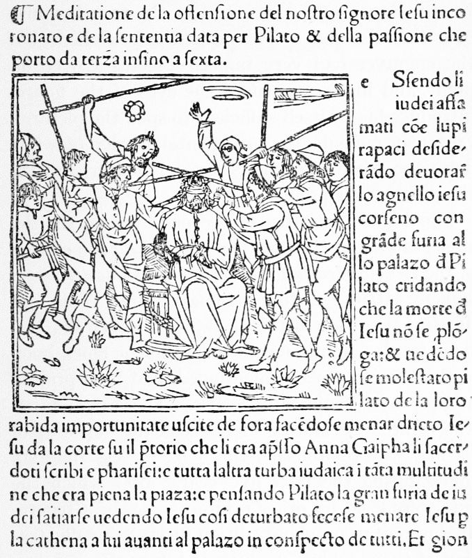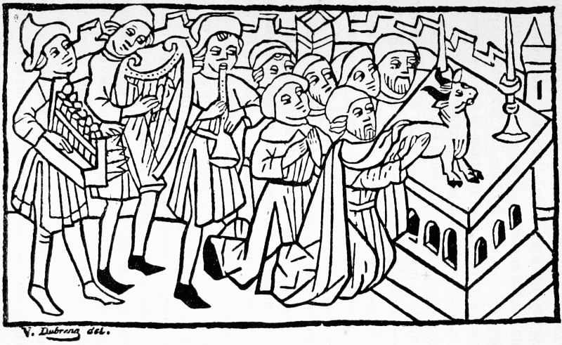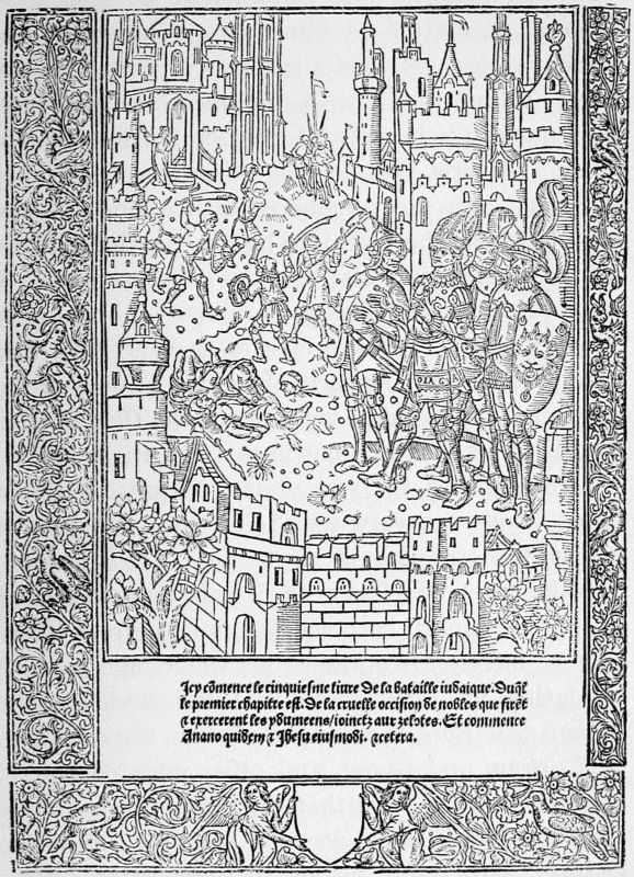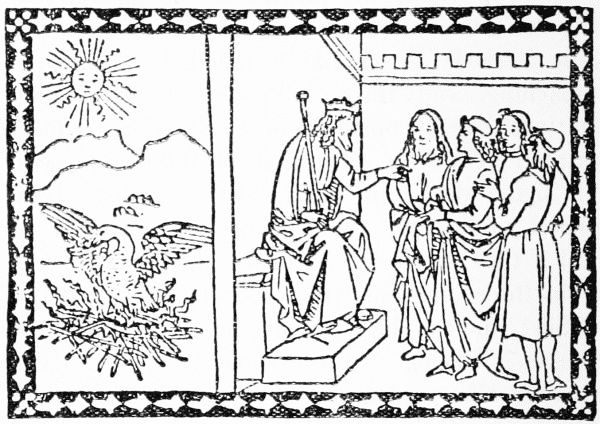 These four books contain altogether no less than 201 cuts, executed in clumsy outline. One hundred and one of these cuts belong to the Edelstein, a collection of German fables written before 1330. The book which contains them is a small folio of 28 leaves, and with a width of page larger by a fourth than the size of the cuts. To fill this gap, Pfister introduced on the left of the illustration a figure of a man. In the dated copy, in which the cuts are more worn, this figure is the same throughout the book; in the undated there are differences in the man's headgear, and in the book or tablet he is holding, constituting three different variations. In the Buch der vier Historien the cuts number 55, six of which, however, are repeated, making 61 impressions. In the impossibility of obtaining access to the originals, while the Spencer Collection was in the course of removal, the careful copy of one of these, made for Camus in 1799, was chosen for repro[Pg 28]duction as likely to be less familiar than the illustrations from Pfister's other books given by Dibdin in his Bibliotheca Spenceriana. The subject is the solemn sacrifice of a lamb at Bethulia after Judith's murder of Holofernes. The Biblia Pauperum is in three editions, two in German, the third in Latin; each consists of 17 printed leaves, with a large cut formed of five separate blocks illustrating different subjects, but joined together as a whole, on each page.