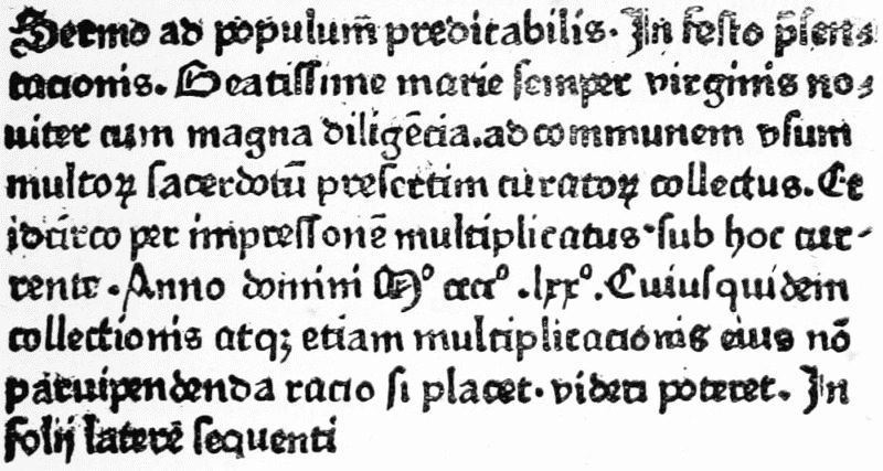 After the introduction of woodcut illustrations,[Pg 30] the next innovation with which we have to concern ourselves is the adoption of the title-page. What may be called accidental title-pages are found on both the Latin and the German edition of a Bull of Pope Pius II. printed by Fust and Schoeffer in 1463. After this Arnold ther Hoernen of Cologne appears to have been the first printer lavish enough to devote a whole page to prefixing a title to a book. A facsimile is here given, from which we see that this 'sermon preachable on the feast of the presentation of the most blessed Virgin' was printed in 1470 at the outset of ther Hoernen's career. The printer, however, seems to have understood no better than Schoeffer the commercial advantage of what he was doing, and the next title-page which has to be chronicled is another of the same kind, reading the 'Tractatulus compendiosus per modum dyalogi timidis | ac deuotis viris editus instruens non plus curam | de pullis et carnibus habere suillis quam quo modo | verus deus et homo qui in celis est digne tractetur. | Ostendens insuper etiam salubres manuductiones quibus | minus dispositus abilitetur,' etc. What we may call the business title of this book is much more sensibly set forth in the brief colophon: 'Explicit exhortacio de celebratione misse per modum dyalogi inter pontificem et sacerdotem, Anno Lxxʓ,' &c. Still, here also, the absence of an incipit, and of any following text must be taken as constituting a title-page. Three years later two Augsburg printers, Bernardus 'pictor' and Erhardus[Pg 32] Ratdolt, who had started a partnership in Venice with Petrus Löslein of Langenzenn in Bavaria, produced the first artistic title-page as yet discovered. This appears in all the three editions of a Calendar which they issued in Latin and Italian in 1476, and in German in 1478. The praises of the Calendar are sung in twelve lines of verse, beginning in the Latin edition:—