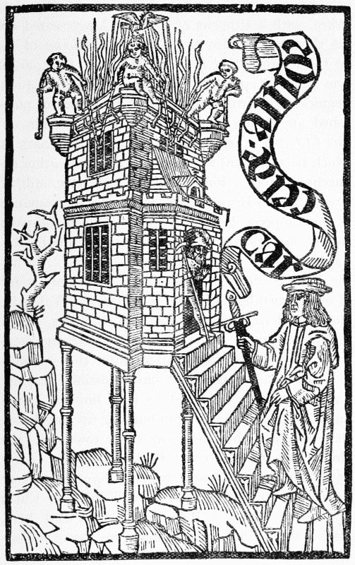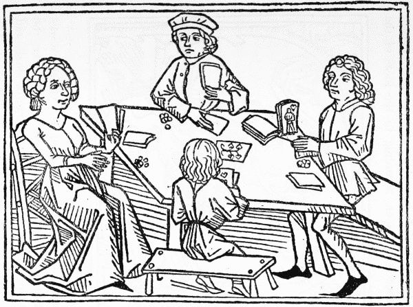 Zainer's first dated book with illustrations is a translation of the Legenda Aurea of Jacobus de Voragine, with a small cut prefacing each of the two hundred and thirty-four biographies. The first part of this was finished in October 1471, and the second in April 1472. In 1472 came also two editions of the Belial or 'processus Luciferi contra Jesum Christum,' in which thirty-two cuts help the under[Pg 38]standing of the extraordinary text, and to the same year belongs Ingold's Das guldin Spiel, a wonderful work, in which the seven deadly sins are illustrated from seven games. As a copy of this book is available, which has had the good fortune to escape the colourist, one of its twelve cuts—that showing card-playing, with which an Augsburg woodcutter would be especially familiar—is here reproduced. The face of the man at the far end of the table is perhaps the most expressive piece of drawing in all the series. In 1473 Zainer printed for the Abbot of SS. Ulric and Afra a Speculum Humanae Salvationis, with numerous Biblical woodcuts. He also issued two editions in 1473 and 1477 of a Bible, with large initial letters, into each of which is introduced a little picture. At the end of the second of these editions he adds the fine device, shown on p. 40, which it is strange that he should not have used more often. In 1474 he printed an account of the supposed murder of a small boy, named Simon, by the Jews, illustrated with some quite vivid pictures, and to about this time belongs his finest work, an undated edition of the Speculum Humanae Vitae, full of numerous delightful cuts illustrating various trades and callings. In 1477 he illustrated a German edition of the moralisation of the game of Chess by Jacobus de Cessolis, of which Caxton had helped to print an English version a year or two before.